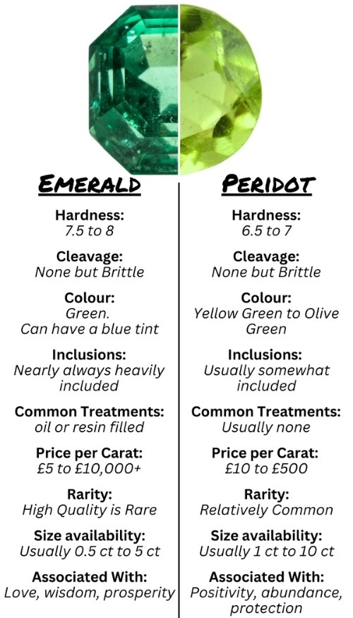 Both gems can be synthesised, and as such lab-grown versions exist in the market for both. Although it’s worth noting that while lab-grown emerald is quiet common, lab-grown peridot is very rarely seen as it’s usually made for industrial use not jewellery making.