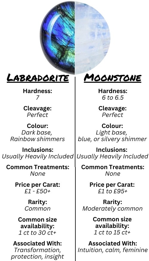 Moonstone and labradorite share a similar hardness and both have perfect cleavage, which means they can chip or fracture if struck. As such, working with them is quite similar. Both make excellent earrings and pendants, but rings and bracelets need a bit of extra protection to prevent scratching or cracking.