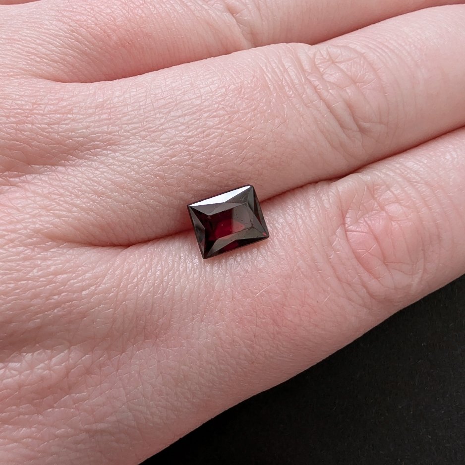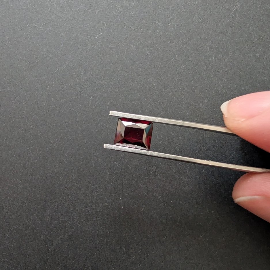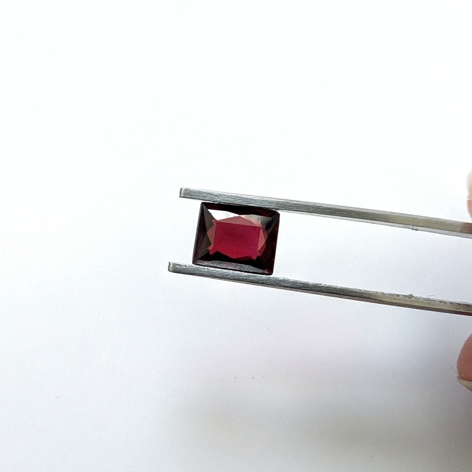 A neat rectangular almandine garnet in a clean, classic red, this eye clean stone has the kind of crisp lines that suit geometric designs and modern minimalist pieces beautifully. Pre-owned and untreated, it’s a sustainably sourced gem ready to become something new.
