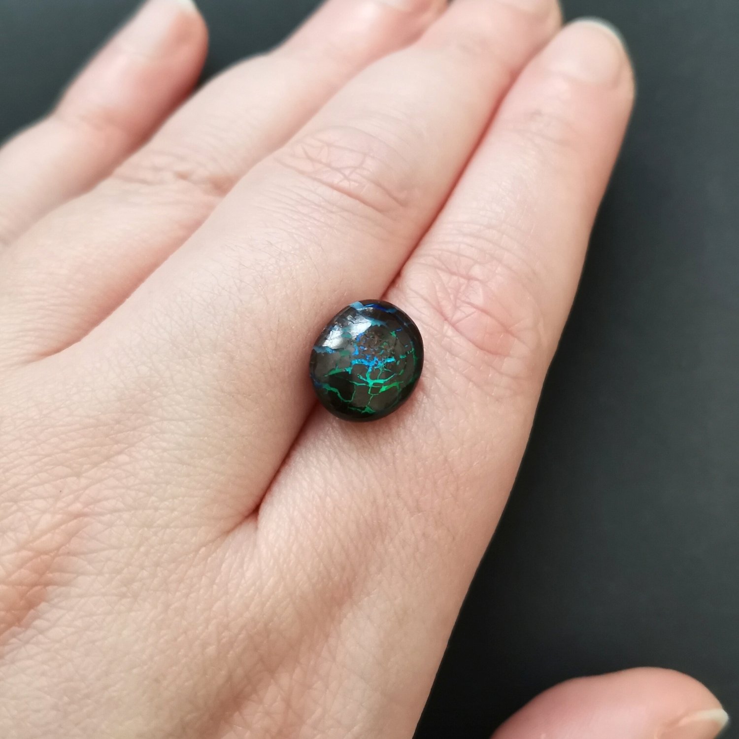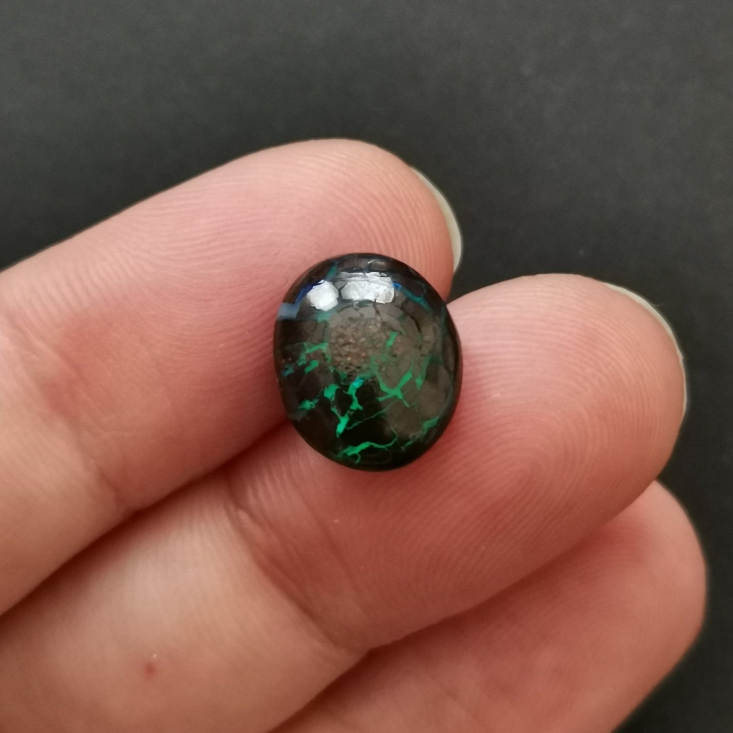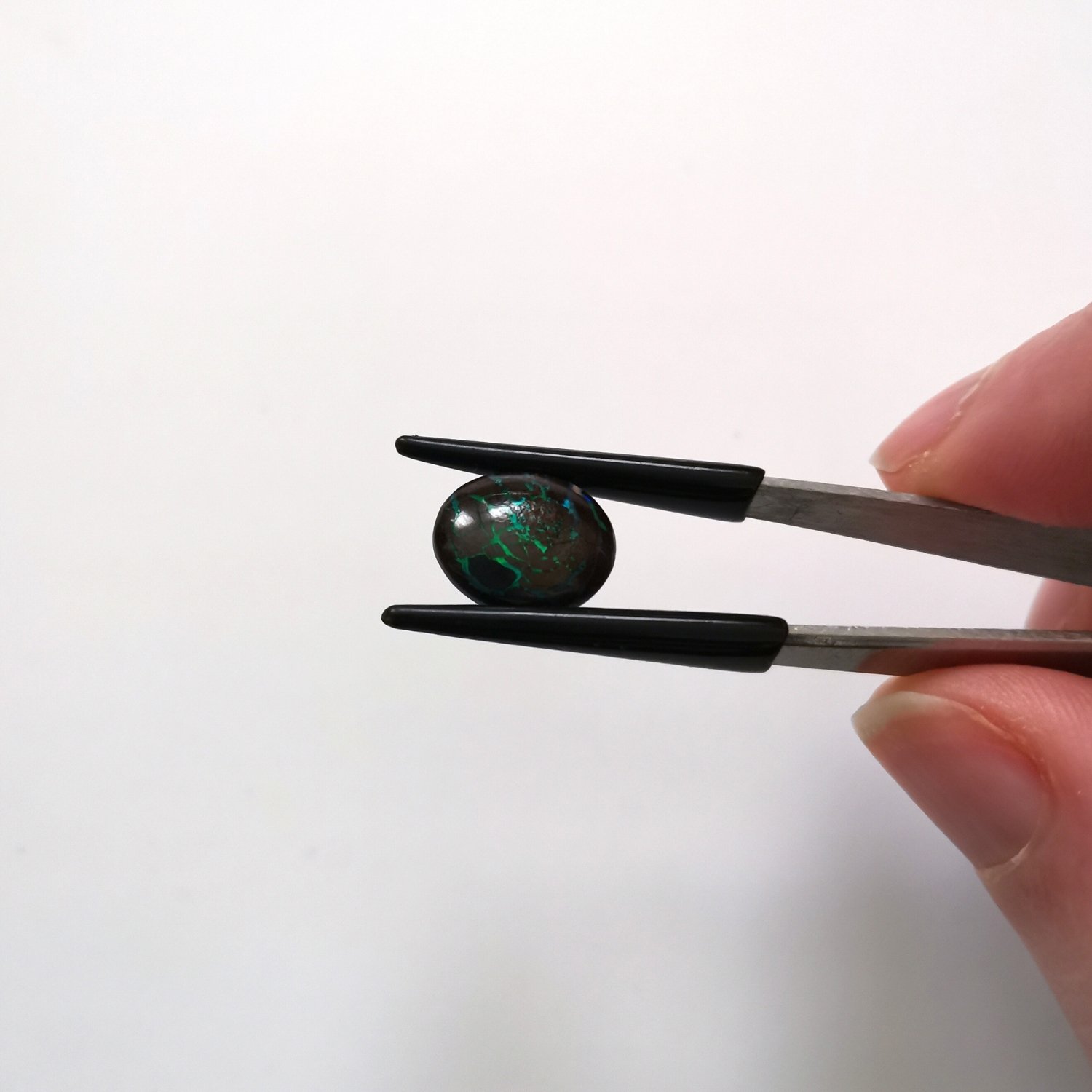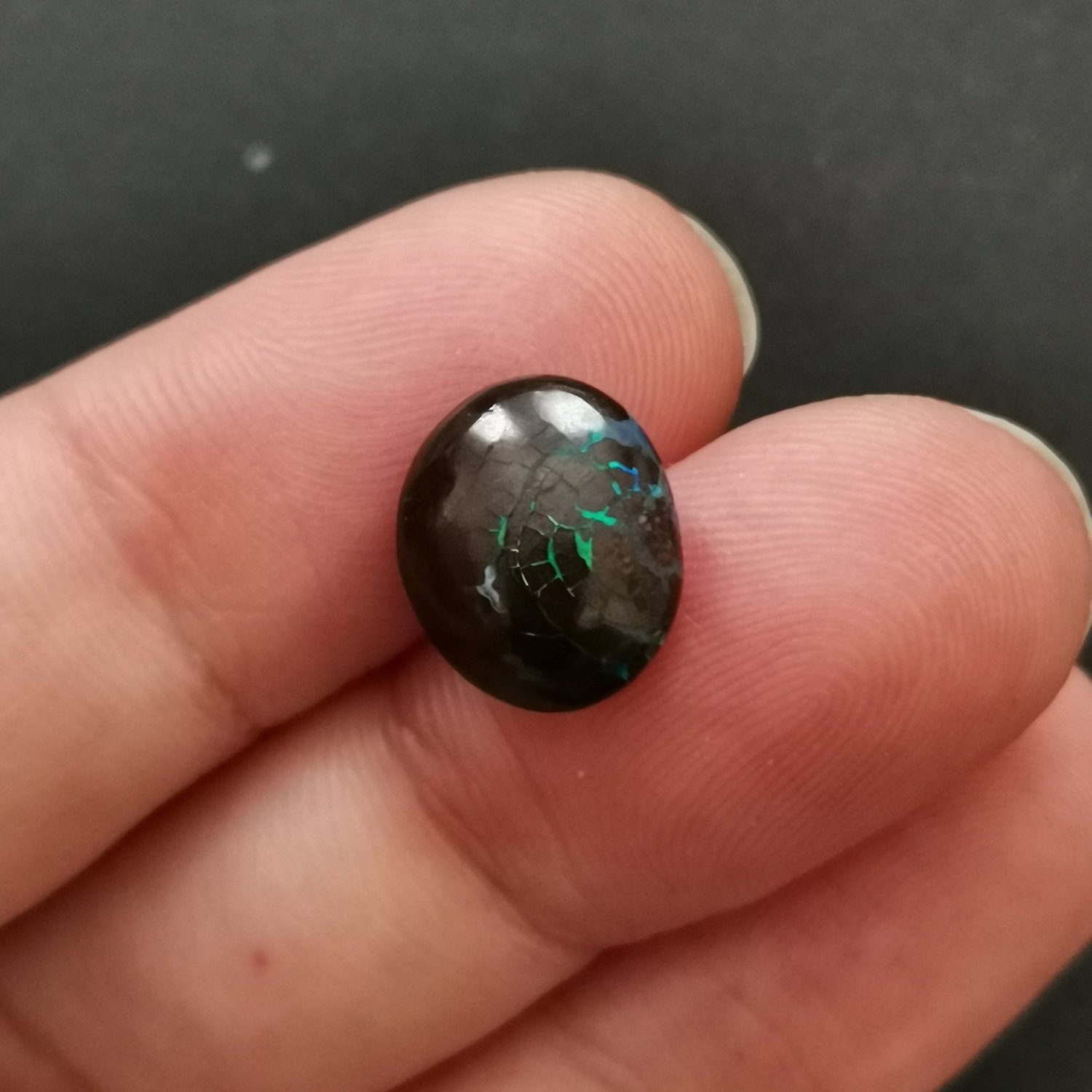 - Colour: dark reddish brown base colour with opal seams. The opal has a strong green and blue play-of-colour.