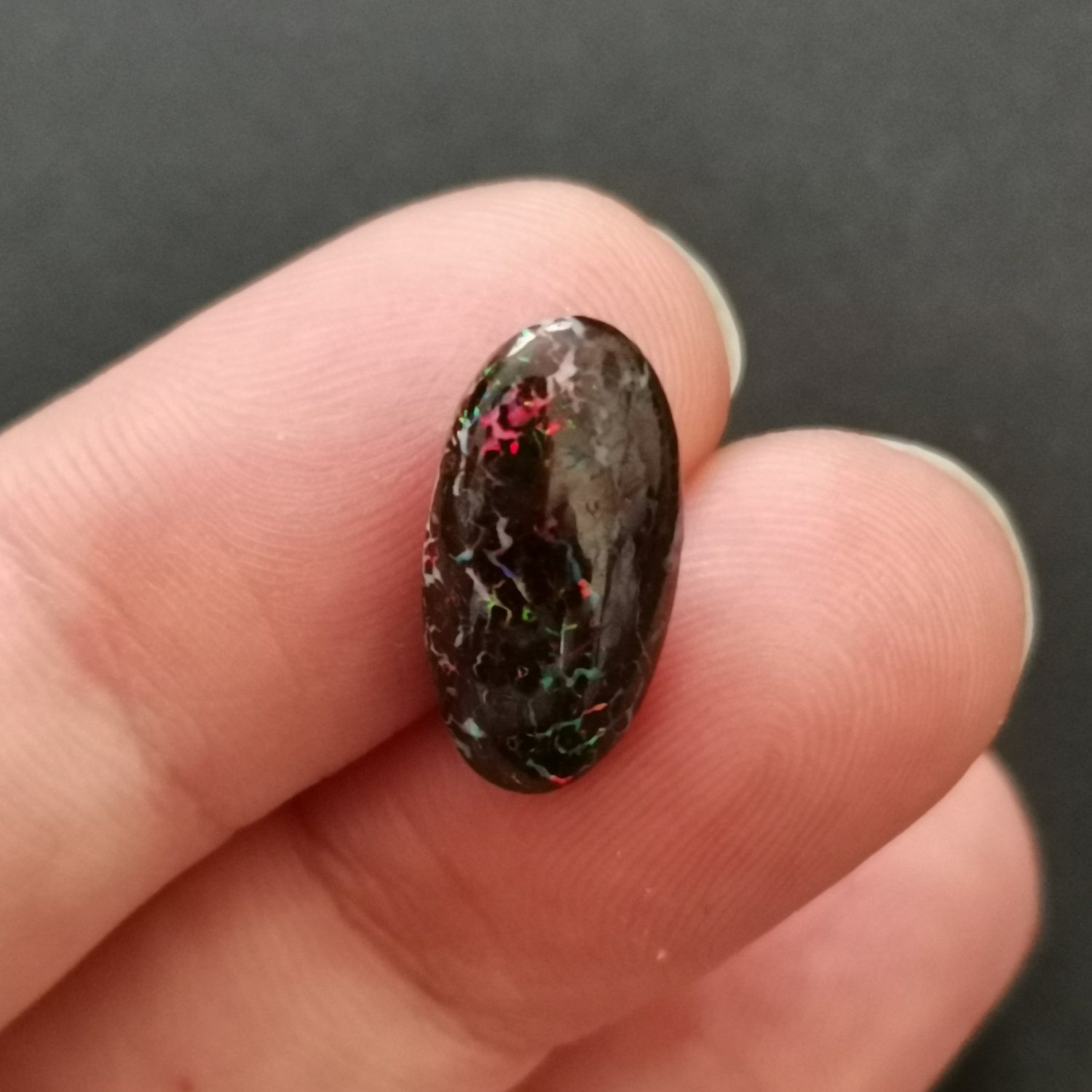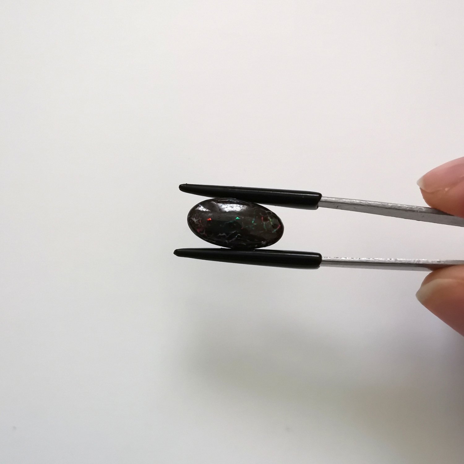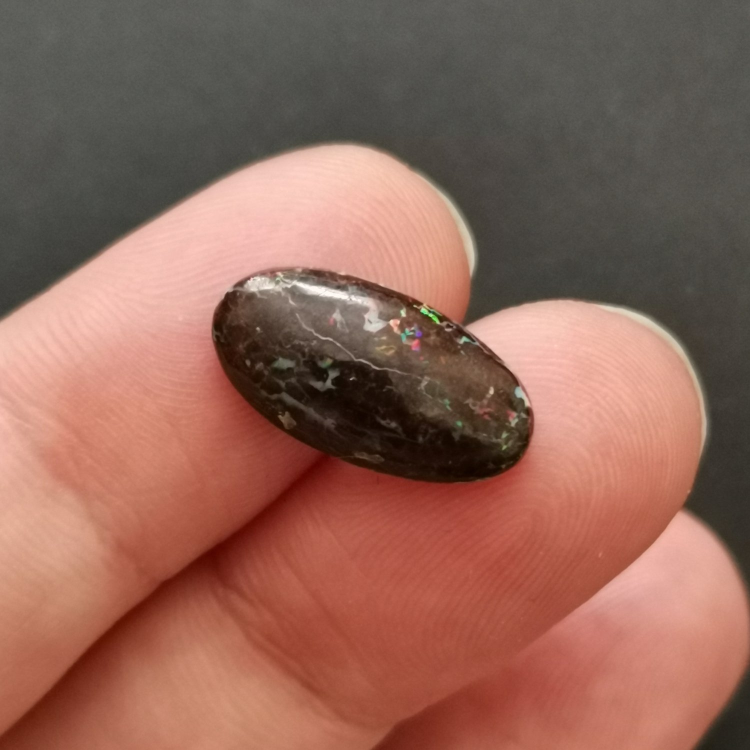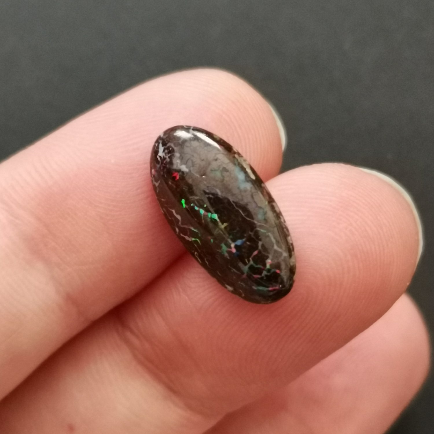 - Colour: dark reddish brown base colour with opal seams. The opal has green, blue orange and red play-of-colour.