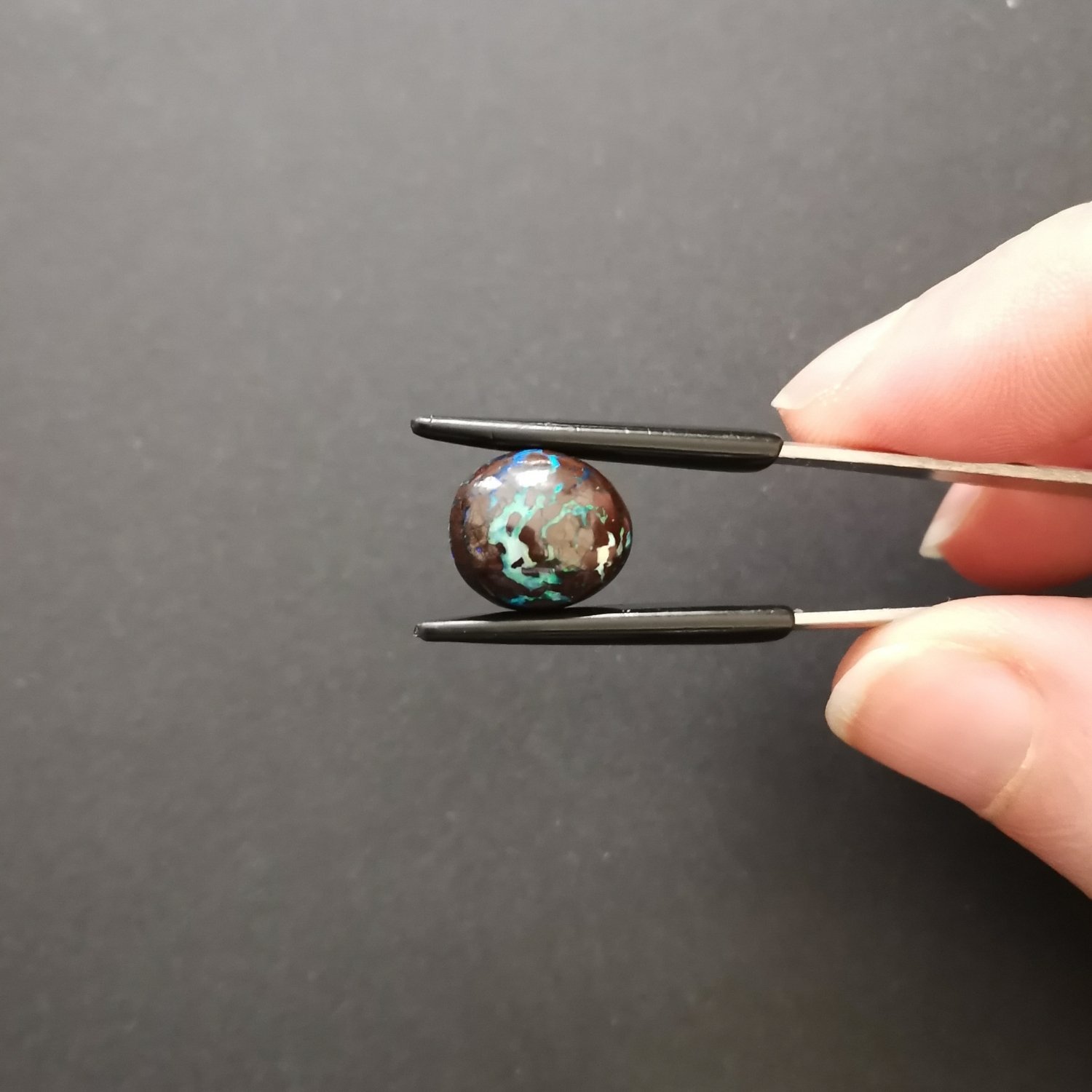 - Colour: dark reddish brown base colour with opal seams. The opal has green and blue play-of-colour.