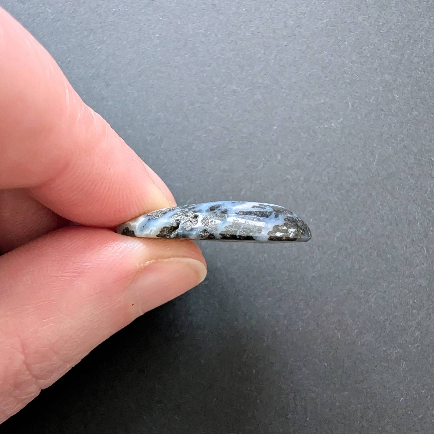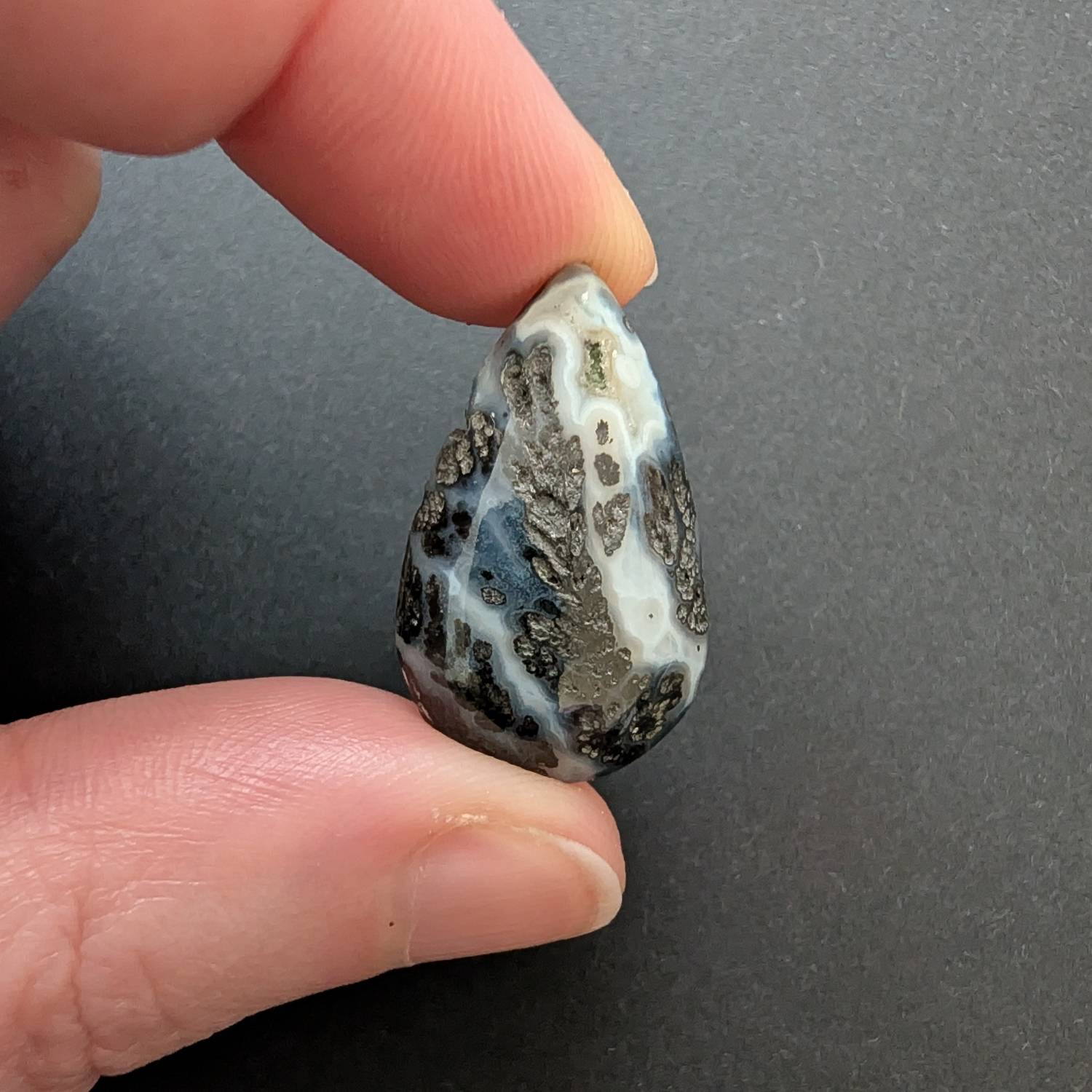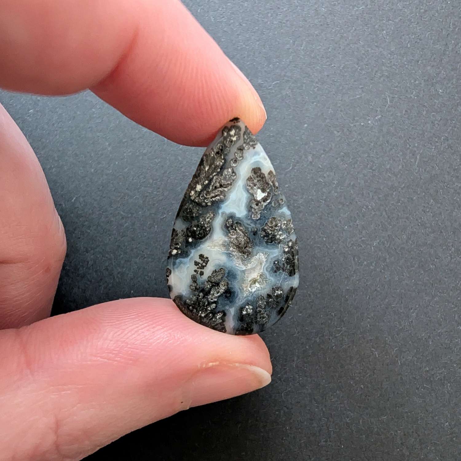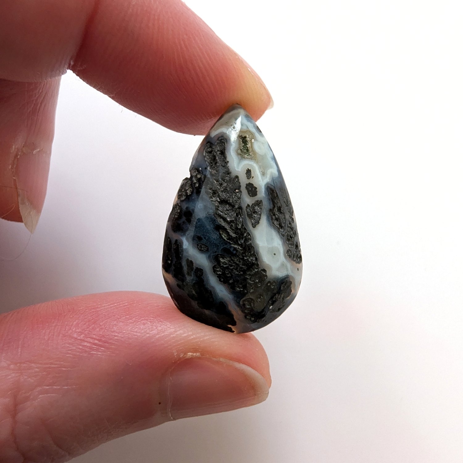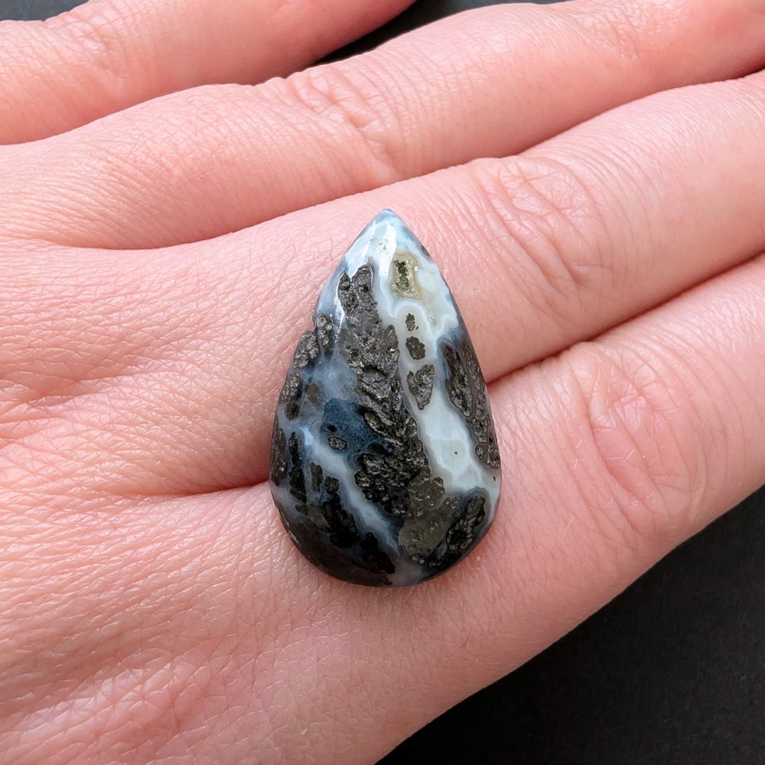 This loose, pre-owned teardrop shaped dendritic agate cabochon, with its mix of grayish blue, black and white tones, is ideal for one-of-a-kind jewellery creations with a more sustainable edge.