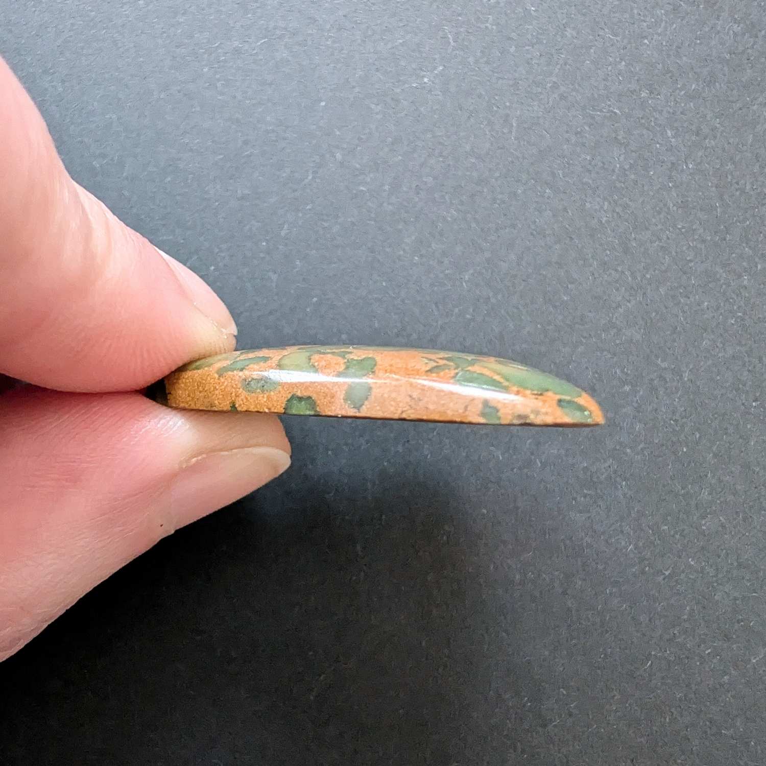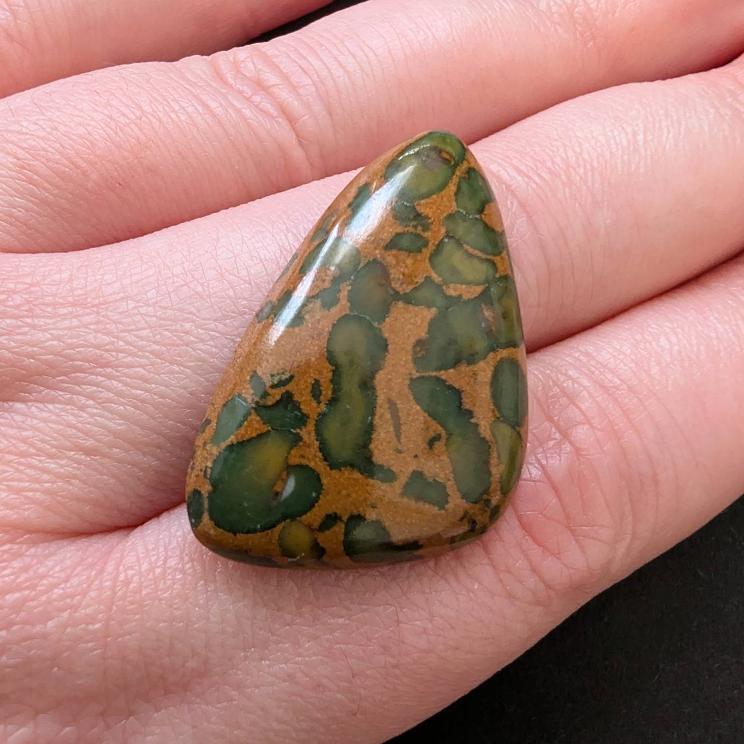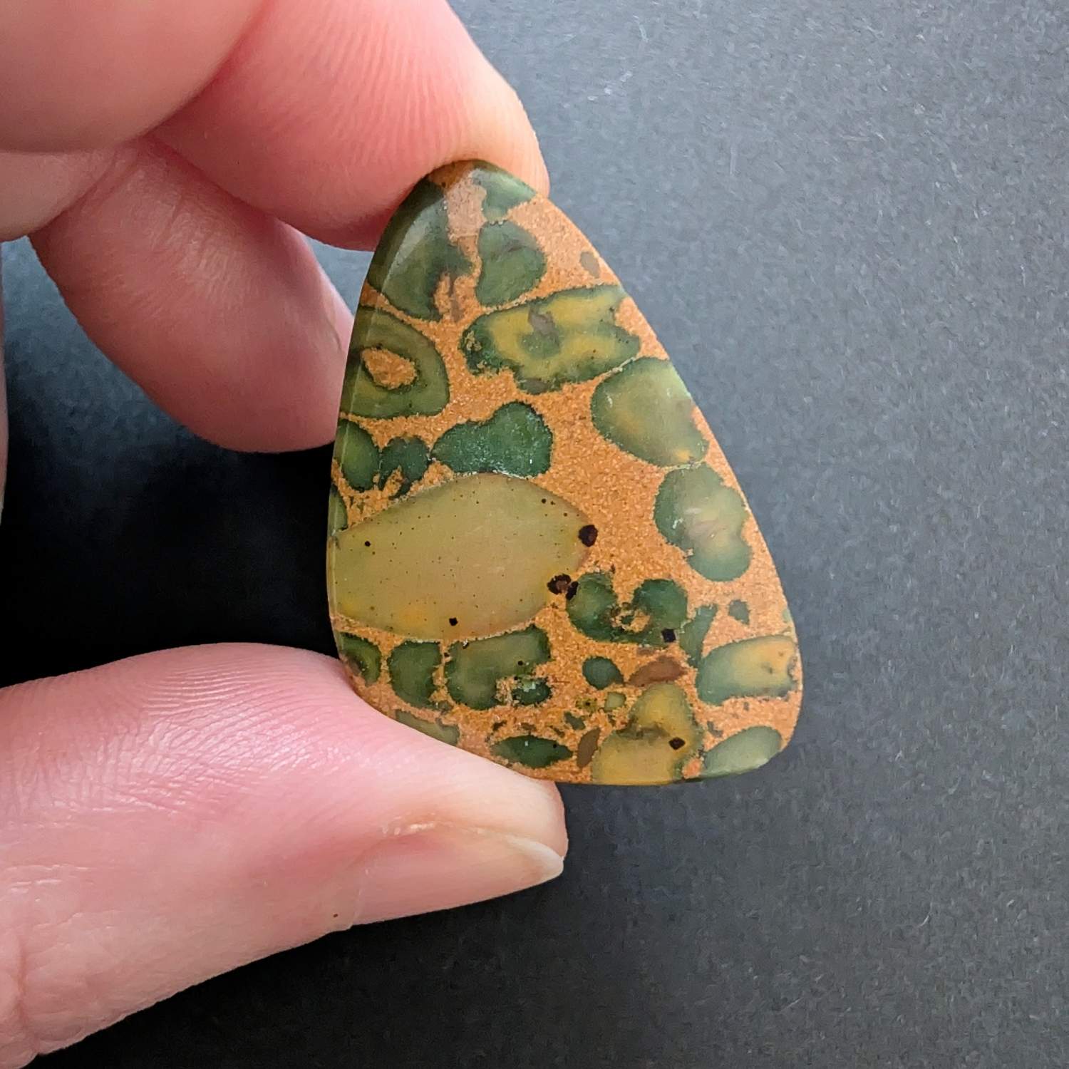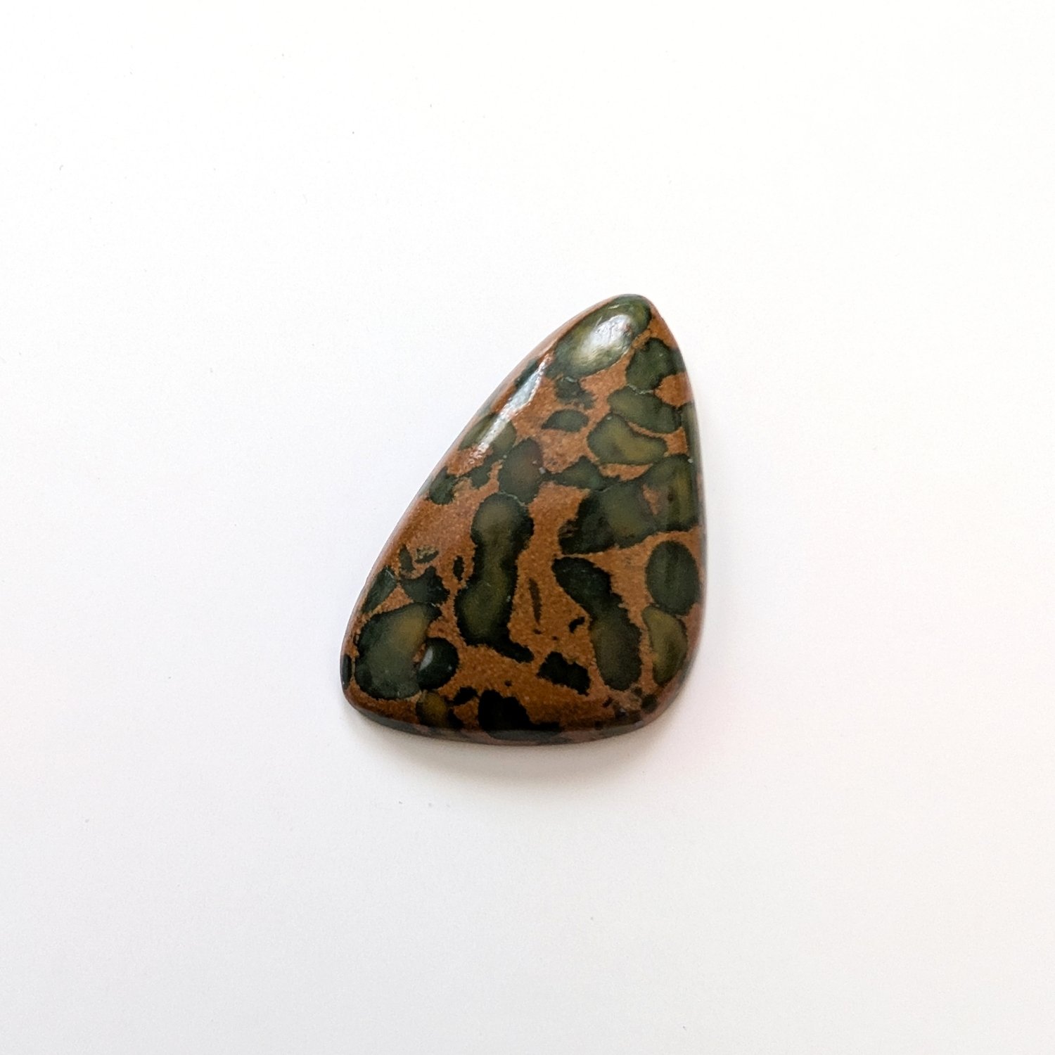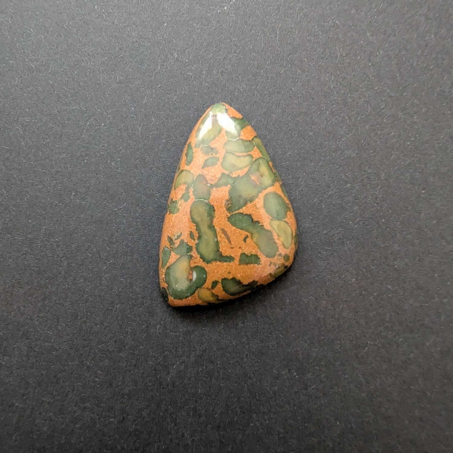 This loose, pre-owned free form fruit jasper cabochon, with its mix of orangy browns, greens and yellows, is ideal for one-of-a-kind jewellery creations with a more sustainable edge.