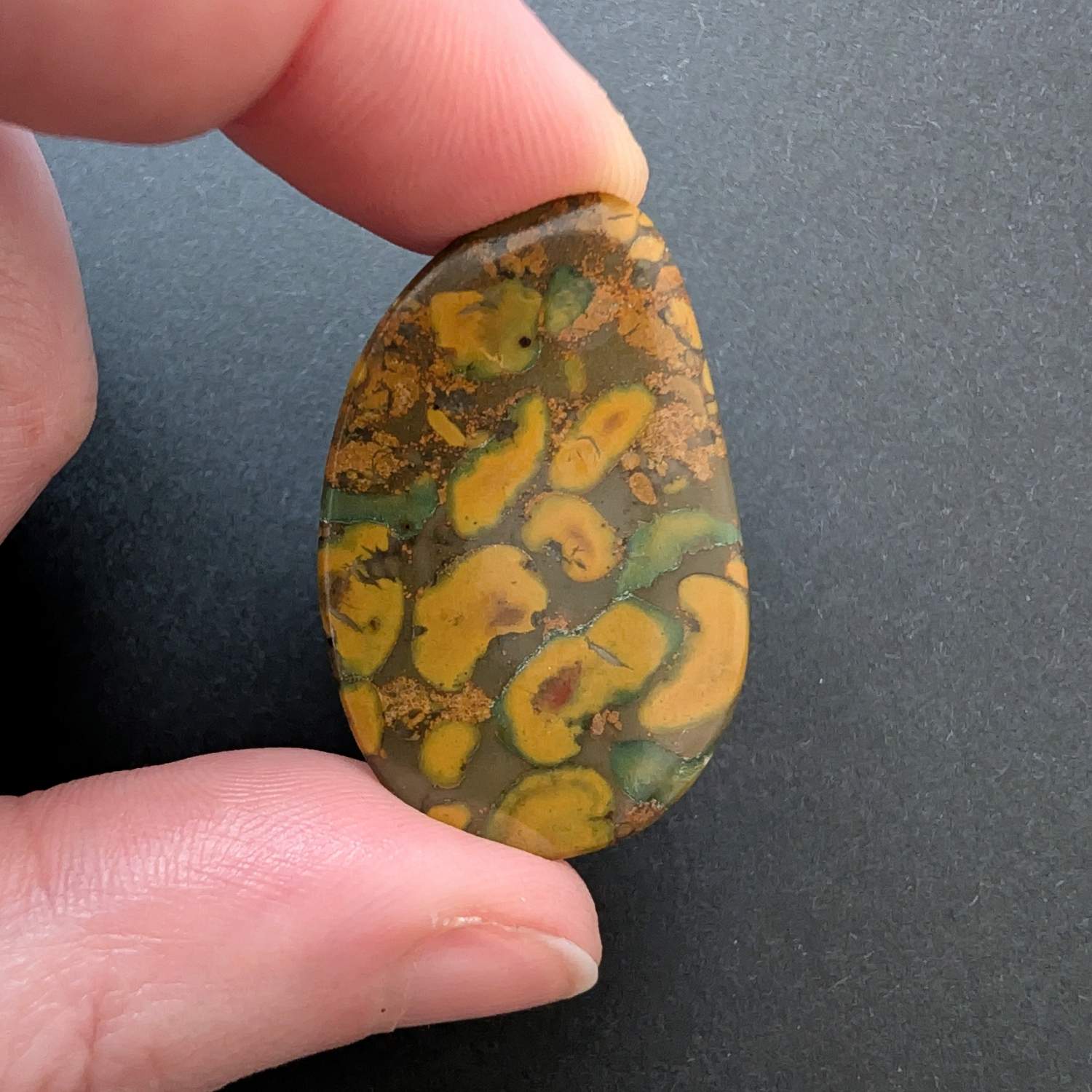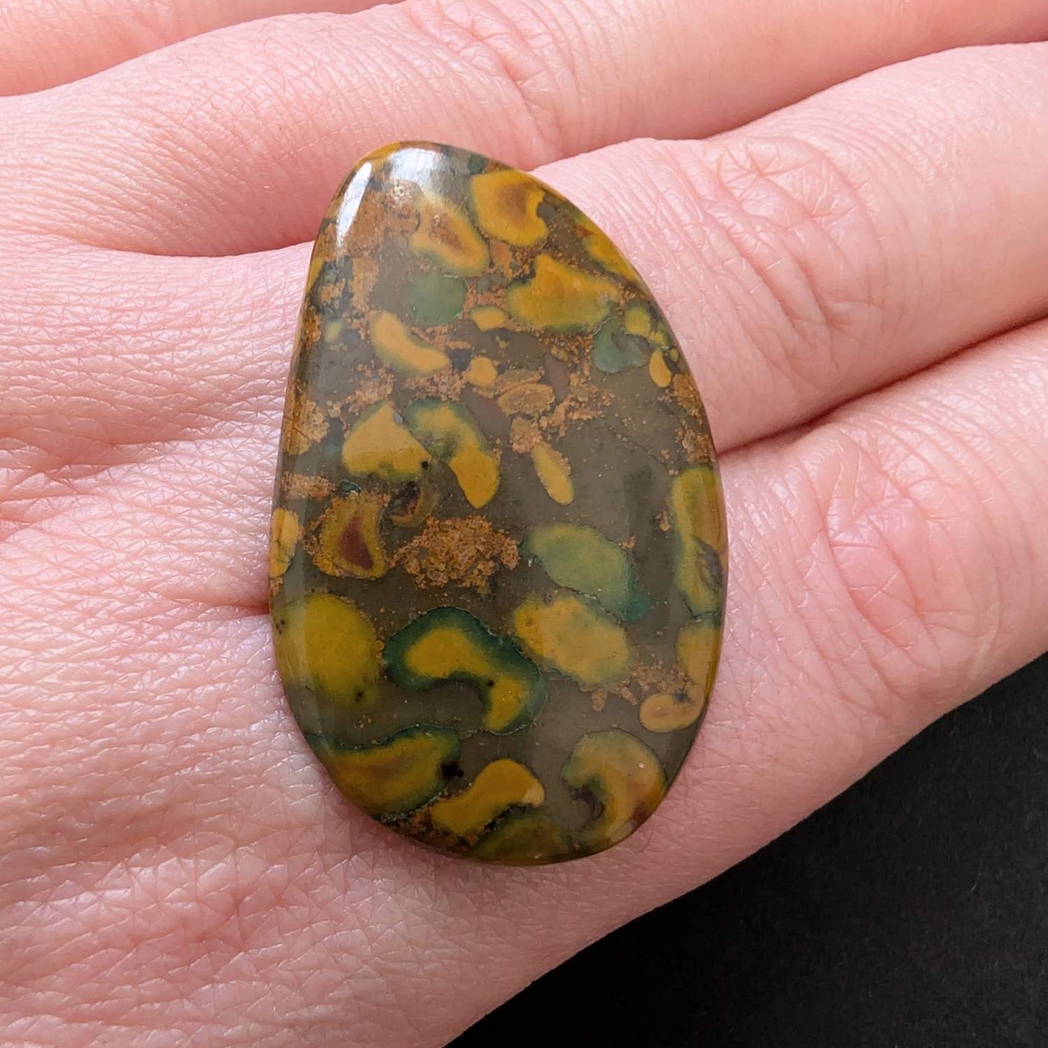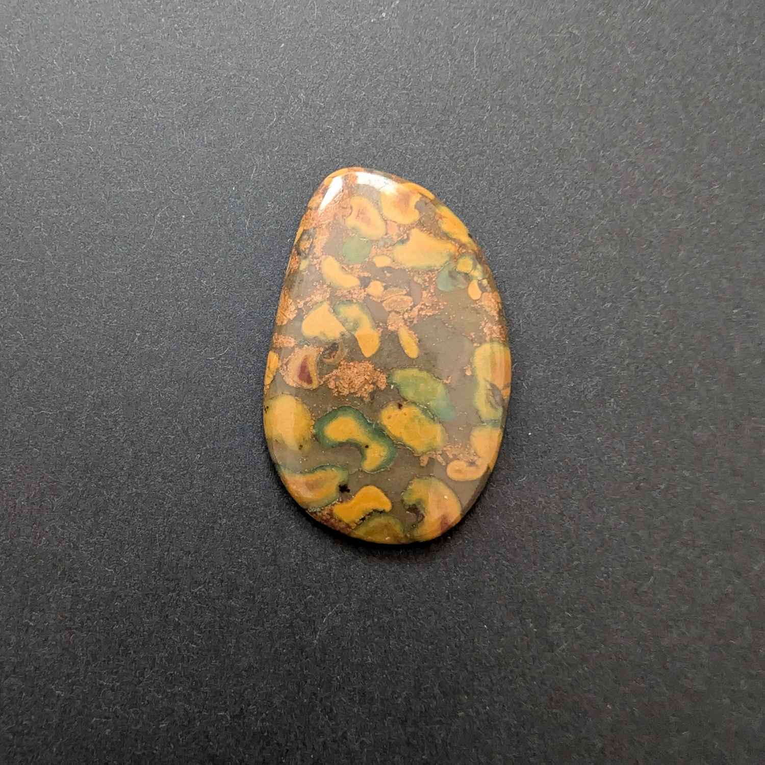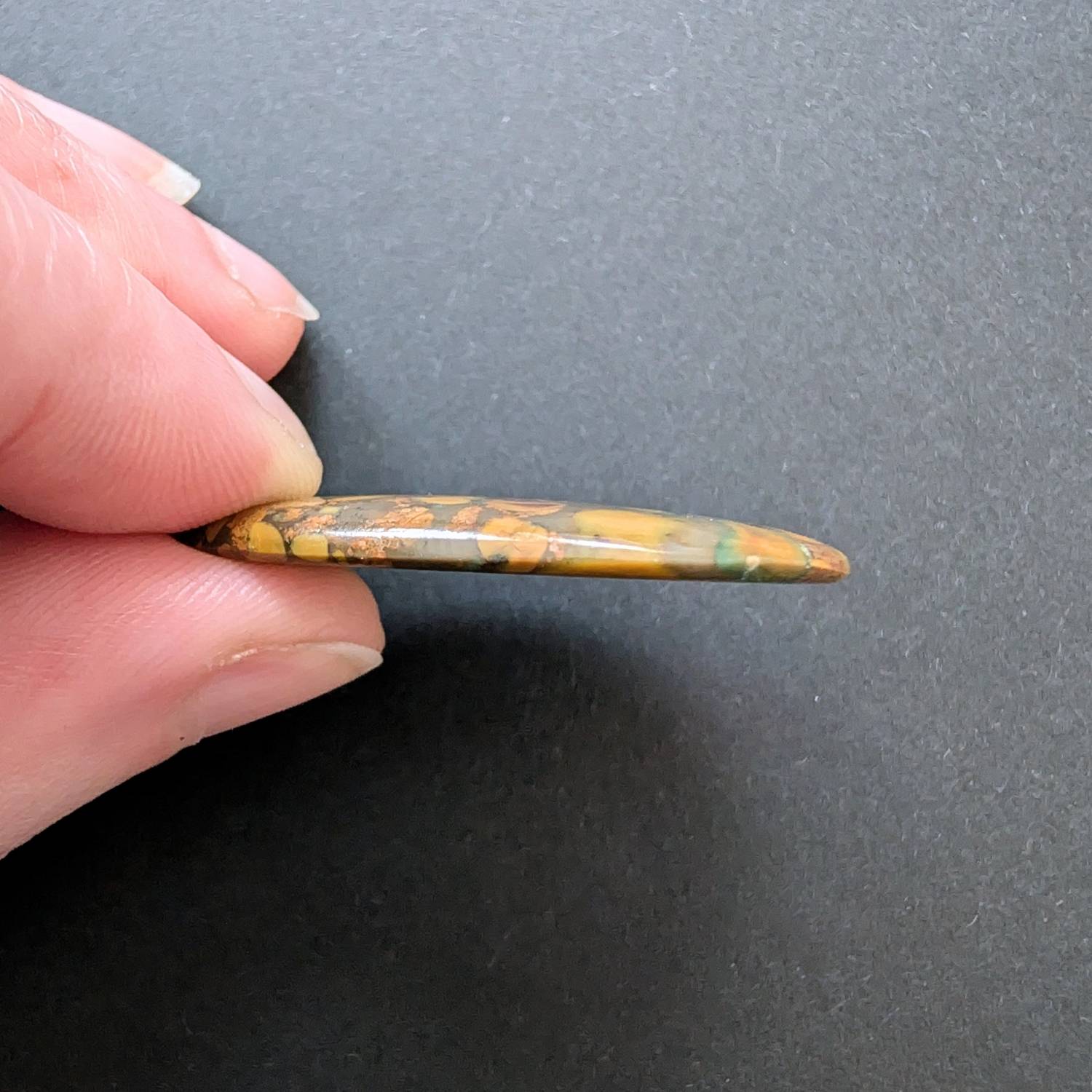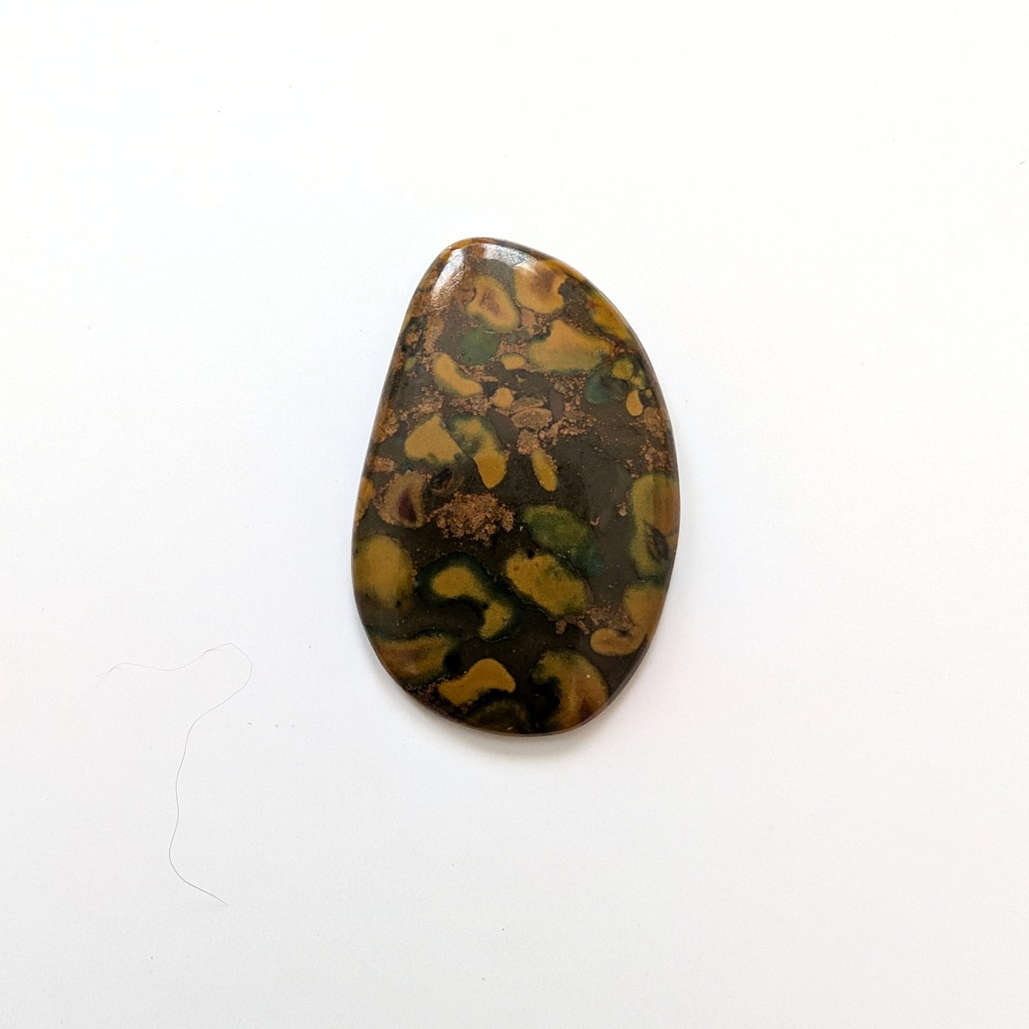 This loose, pre-owned free form fruit jasper cabochon, with its mix of browns, orange and greens, is ideal for one-of-a-kind jewellery creations with a more sustainable edge.