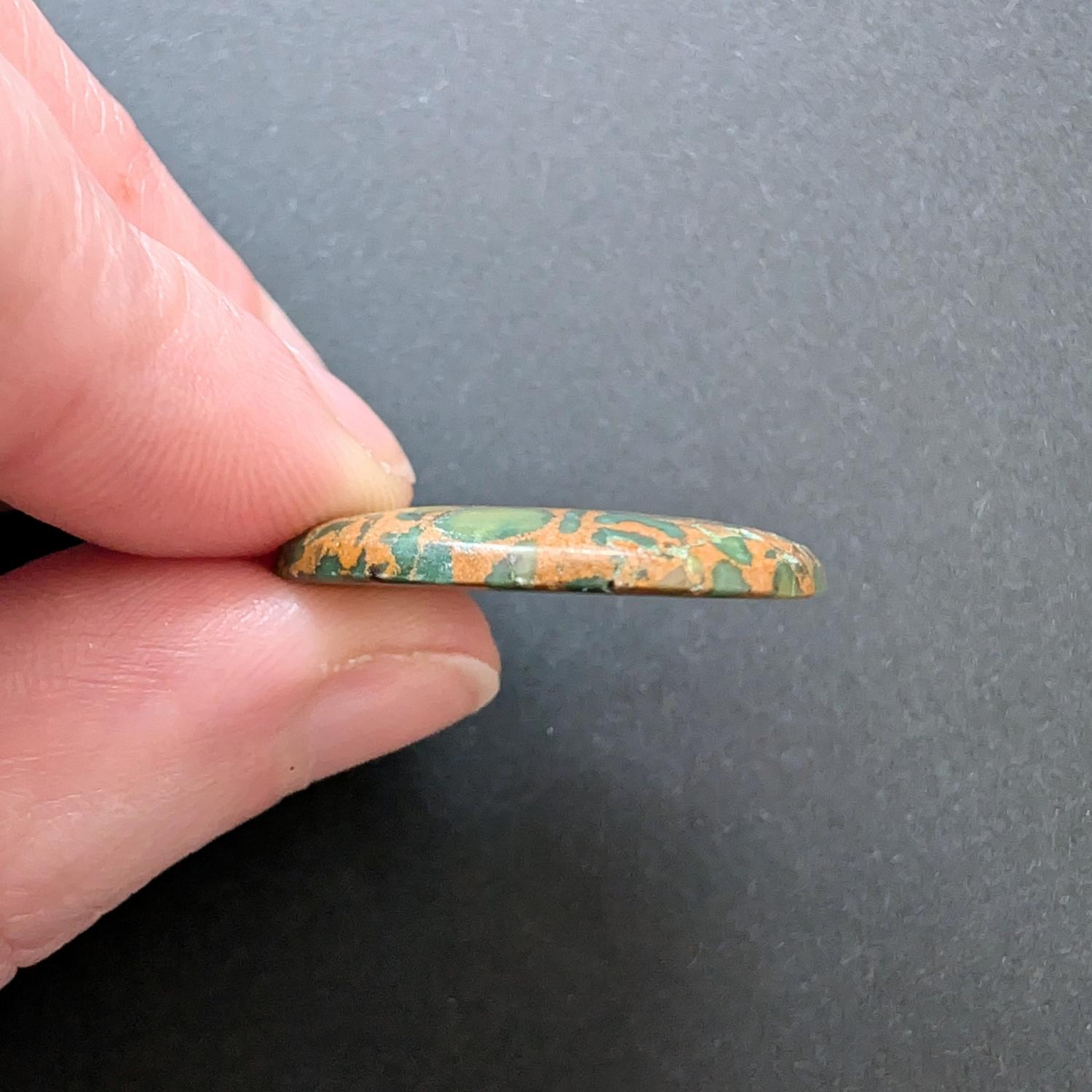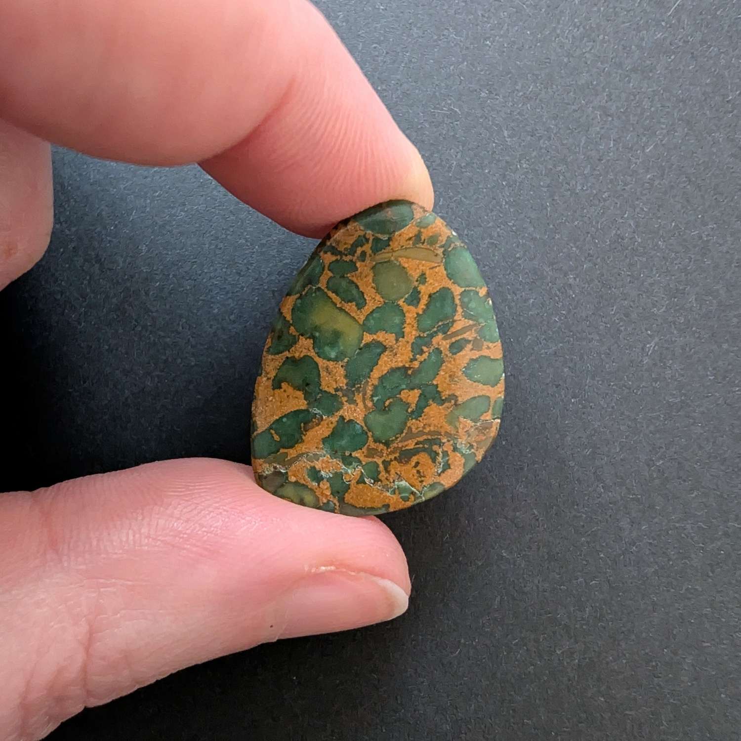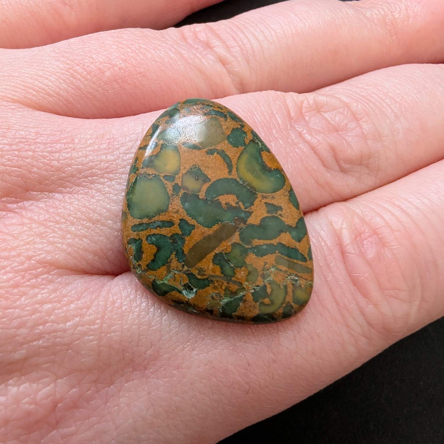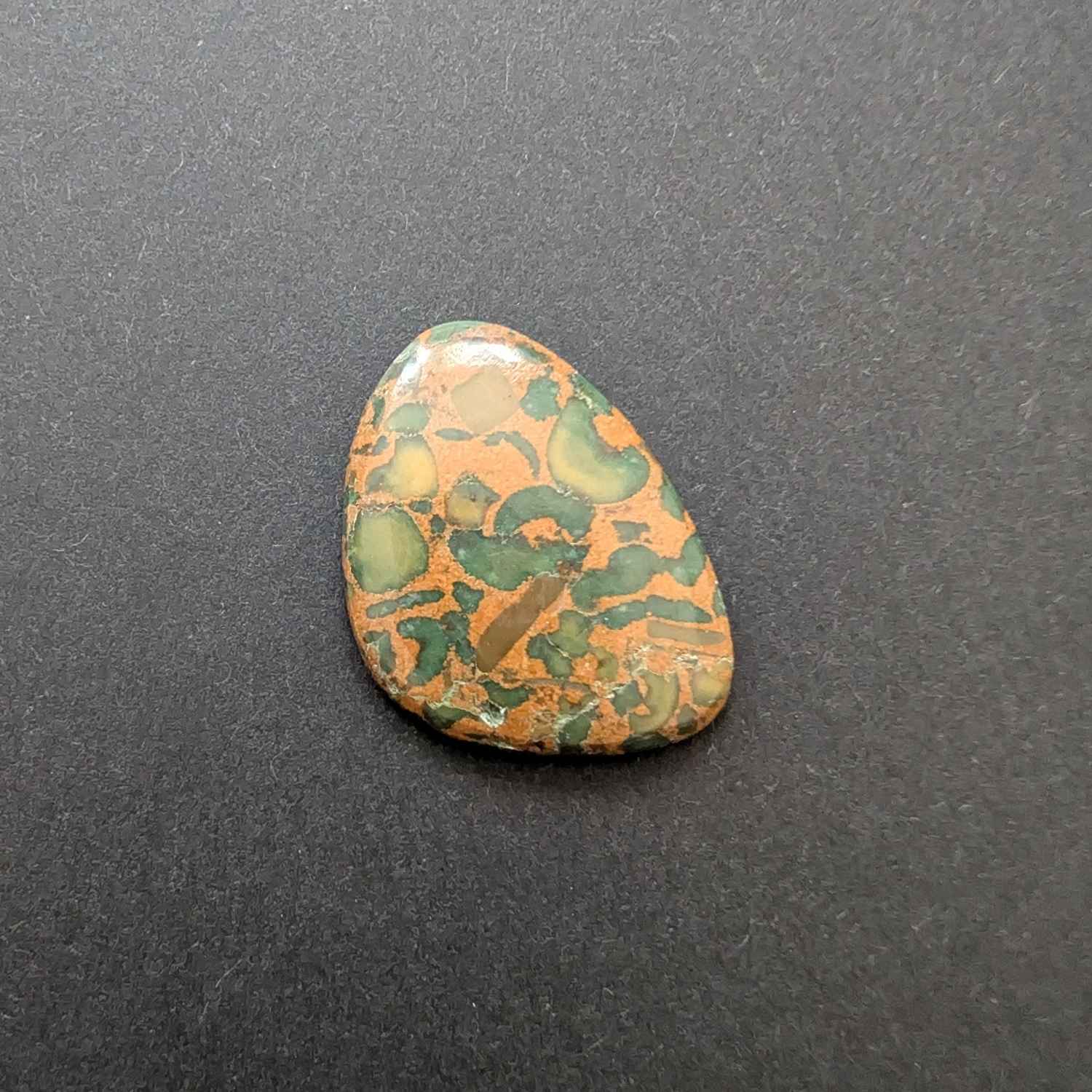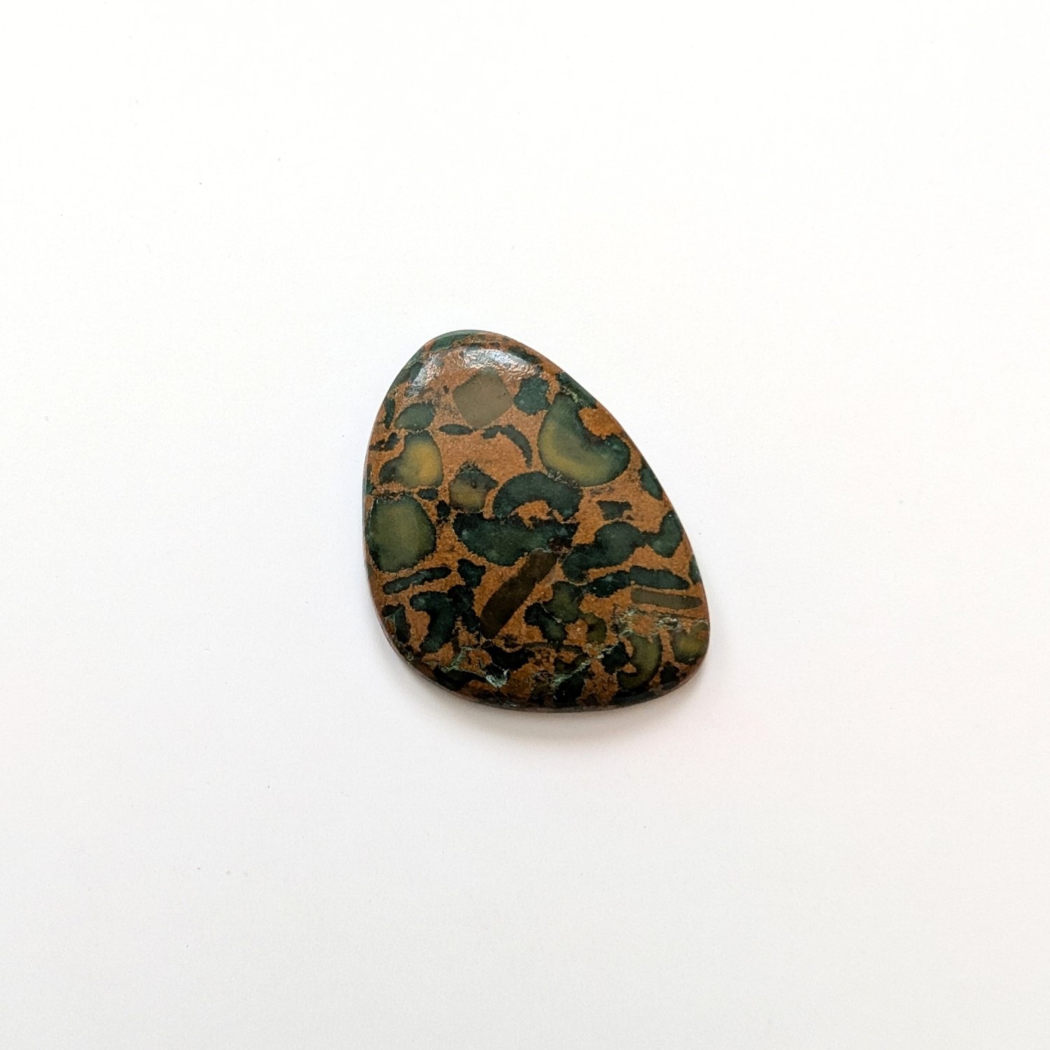 This loose, pre-owned free form fruit jasper cabochon, with its mix of orangy brown, greens, and yellows, is ideal for one-of-a-kind jewellery creations with a more sustainable edge.