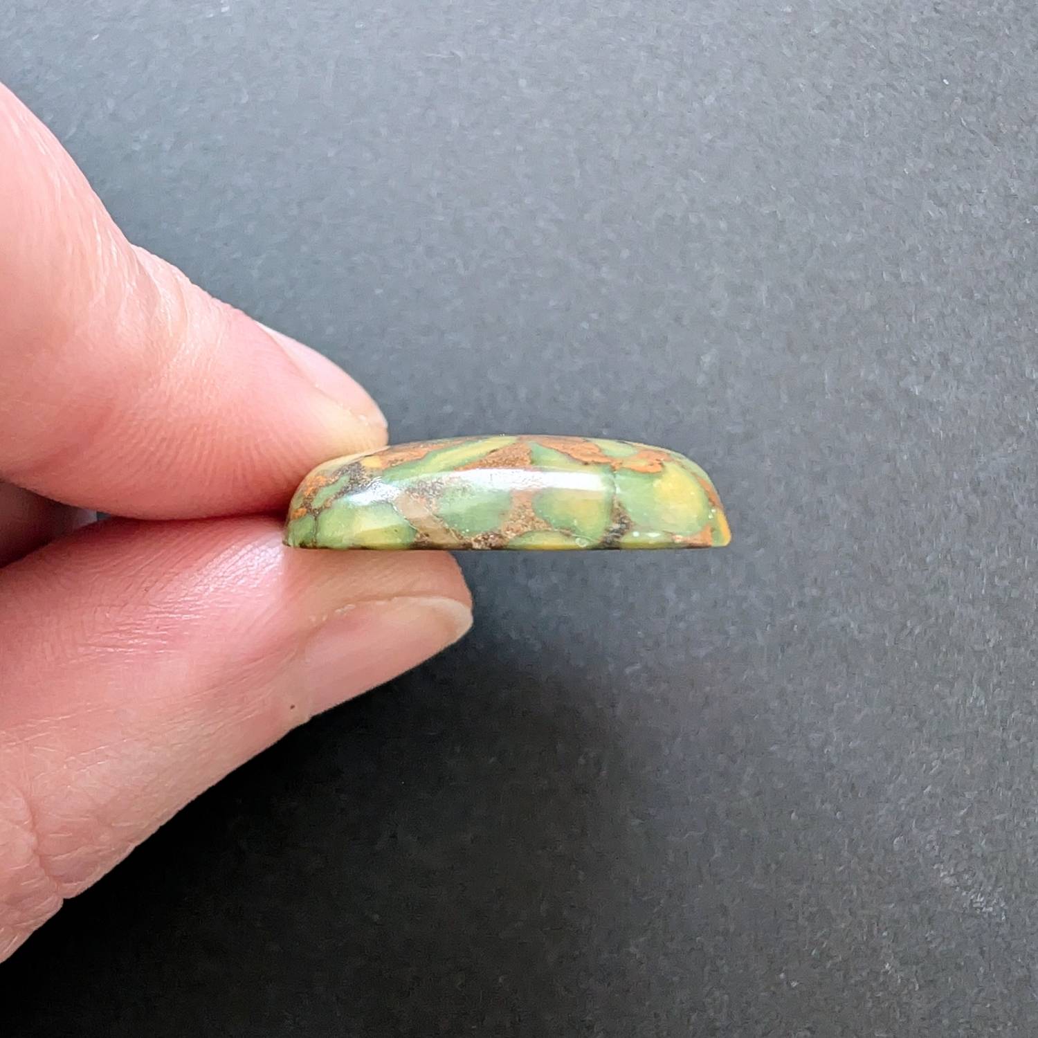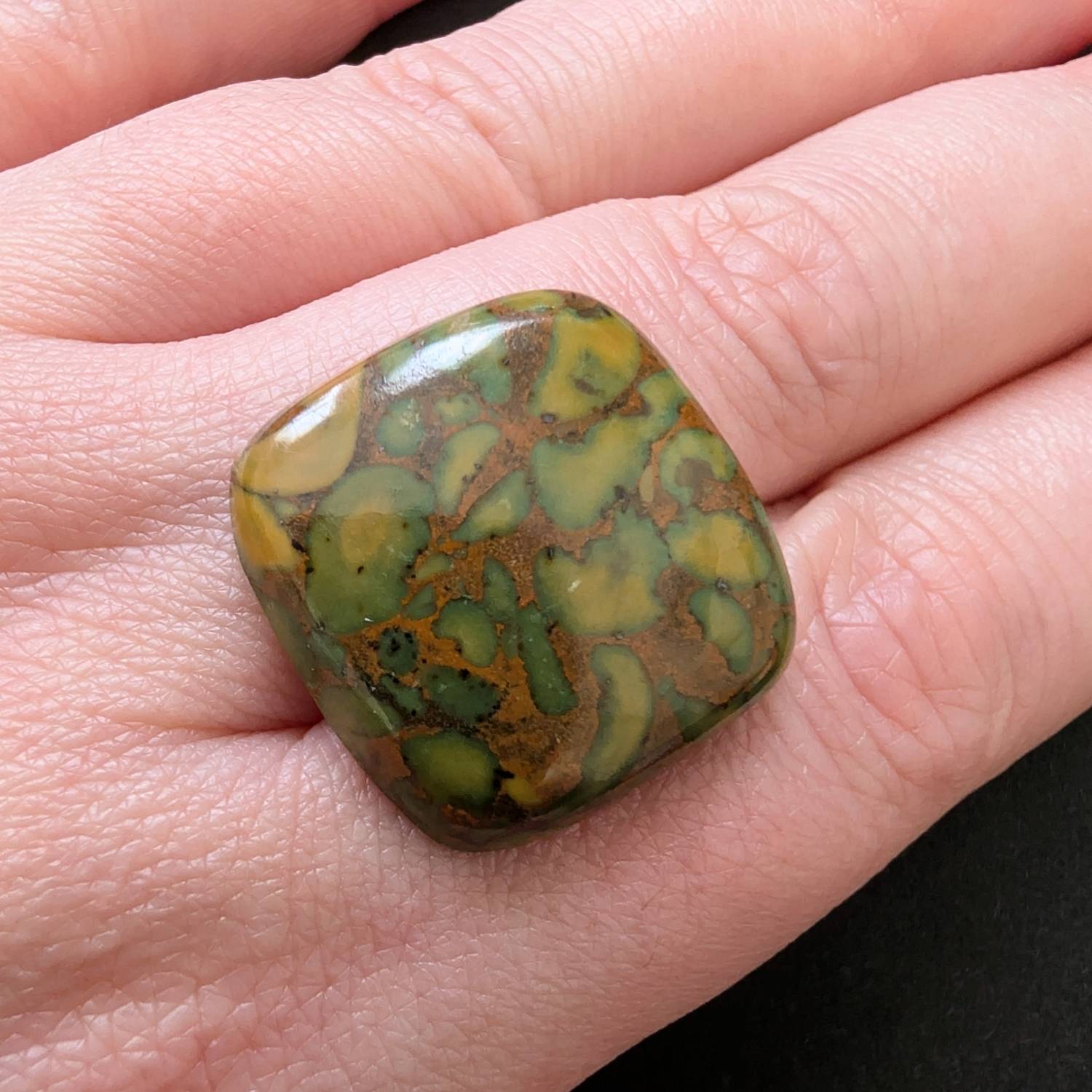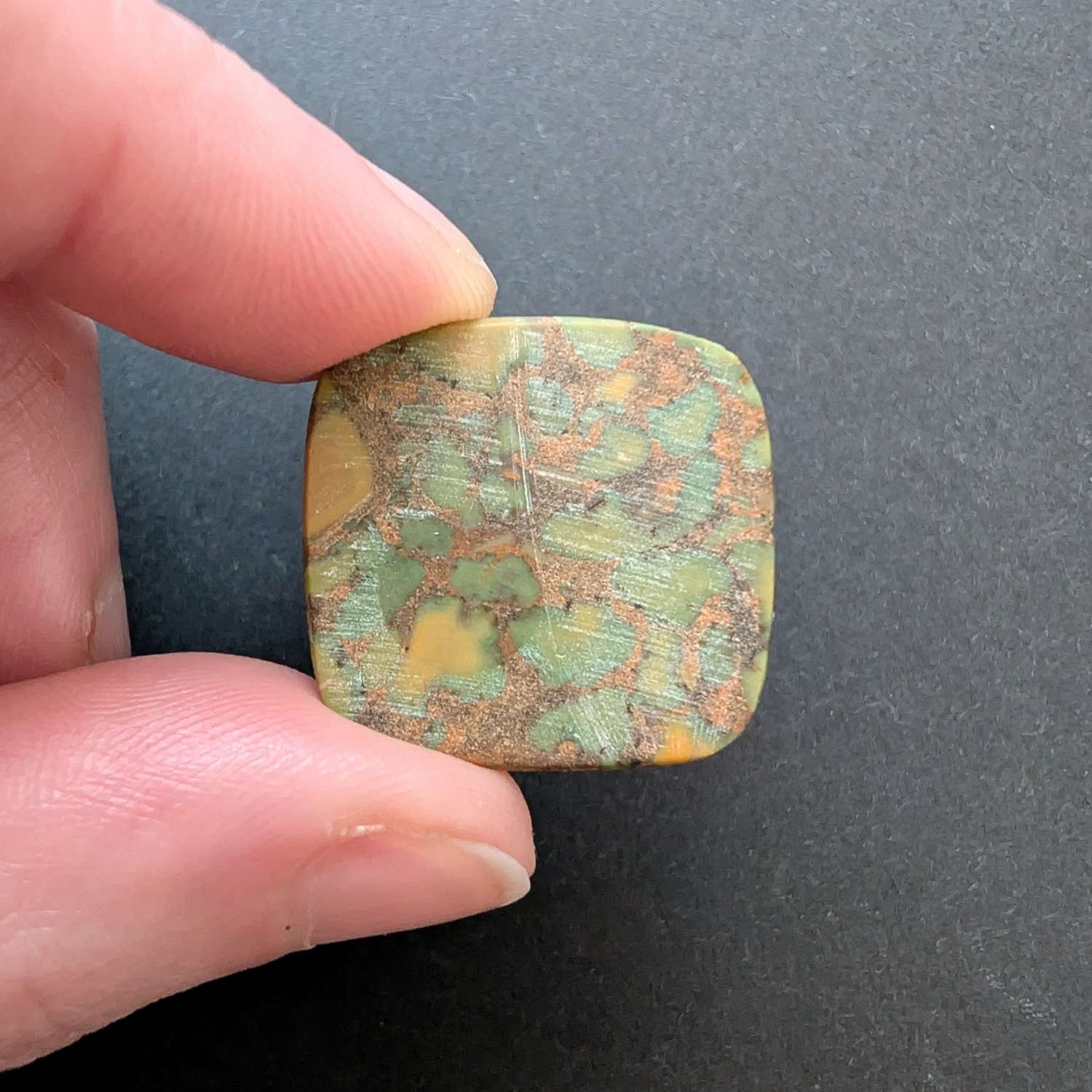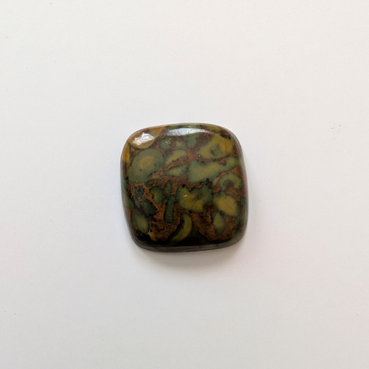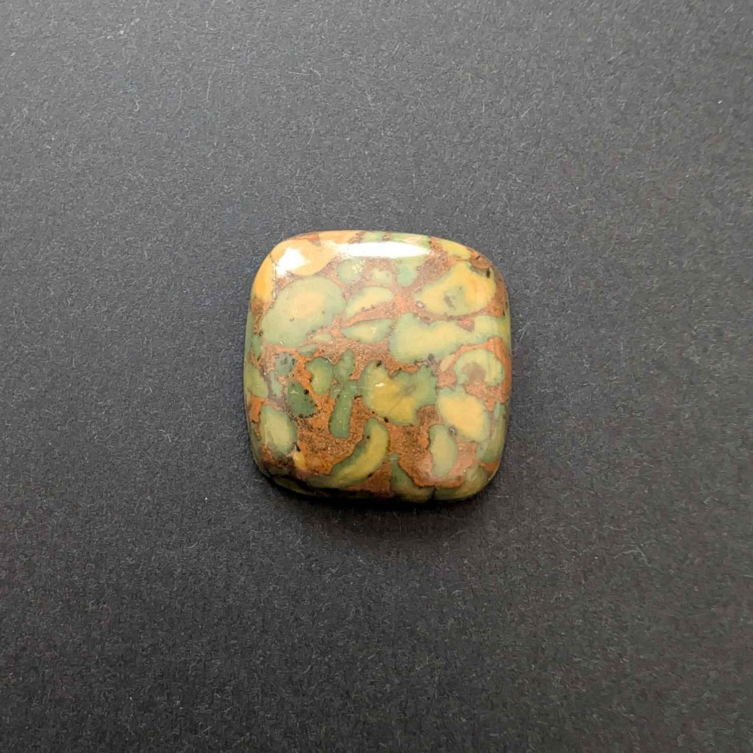 This loose, pre-owned square fruit jasper cabochon, with its mix of reddish brown, greens, and oranges, is ideal for one-of-a-kind jewellery creations with a more sustainable edge.