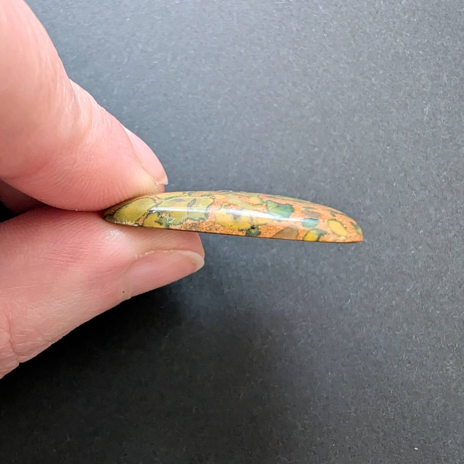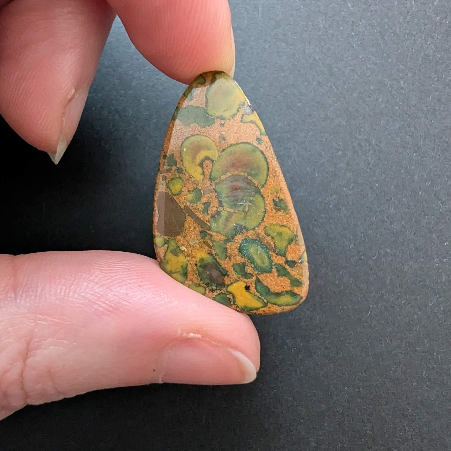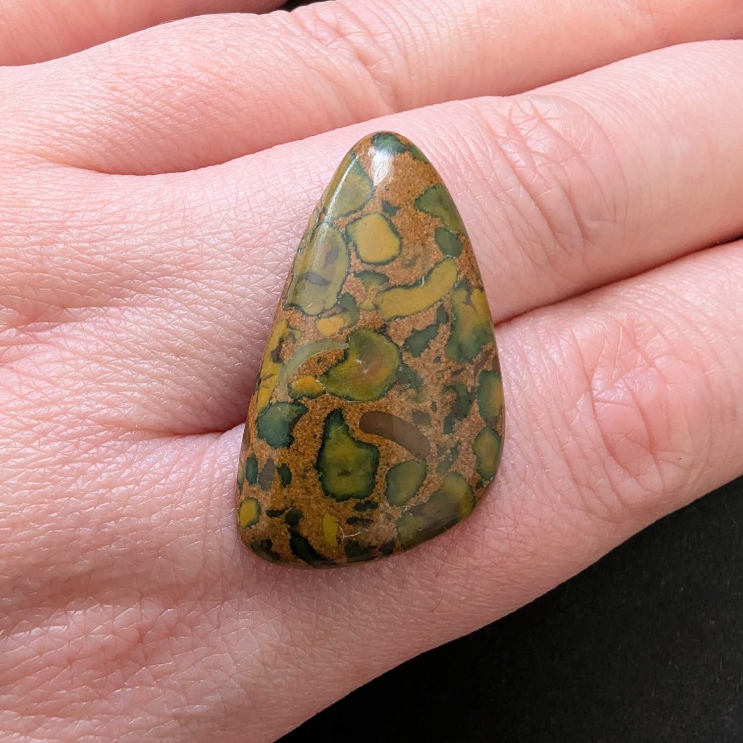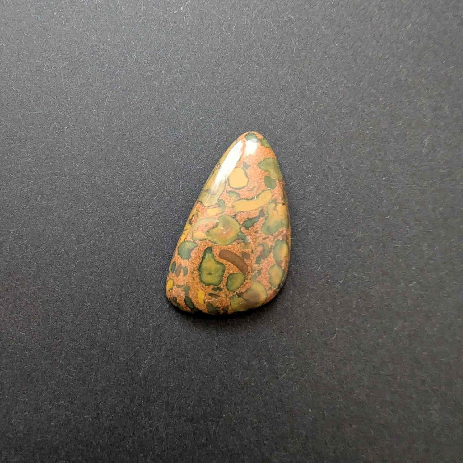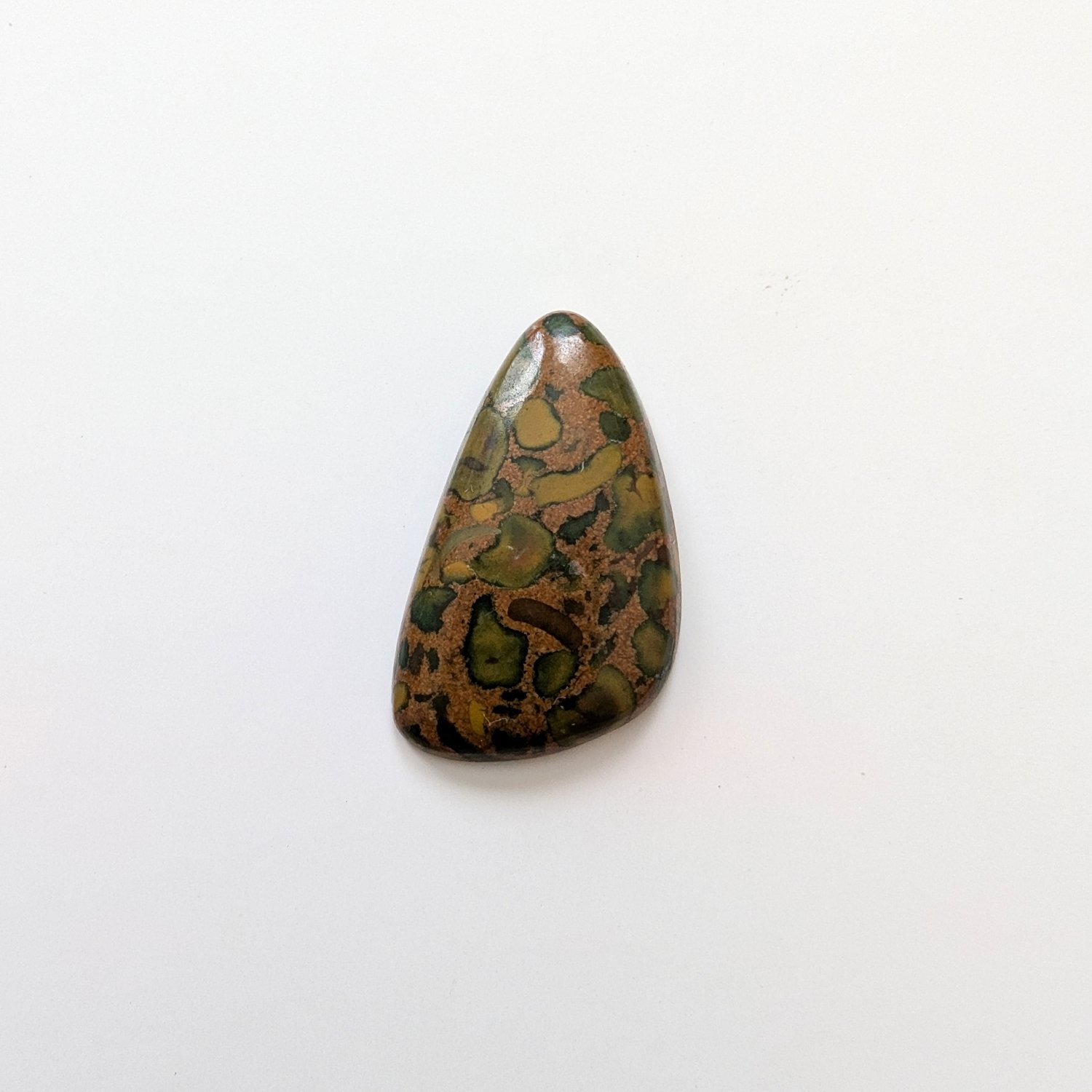 This loose, pre-owned free form fruit jasper cabochon, with its mix of browns, greens, and oranges, is ideal for one-of-a-kind jewellery creations with a more sustainable edge.