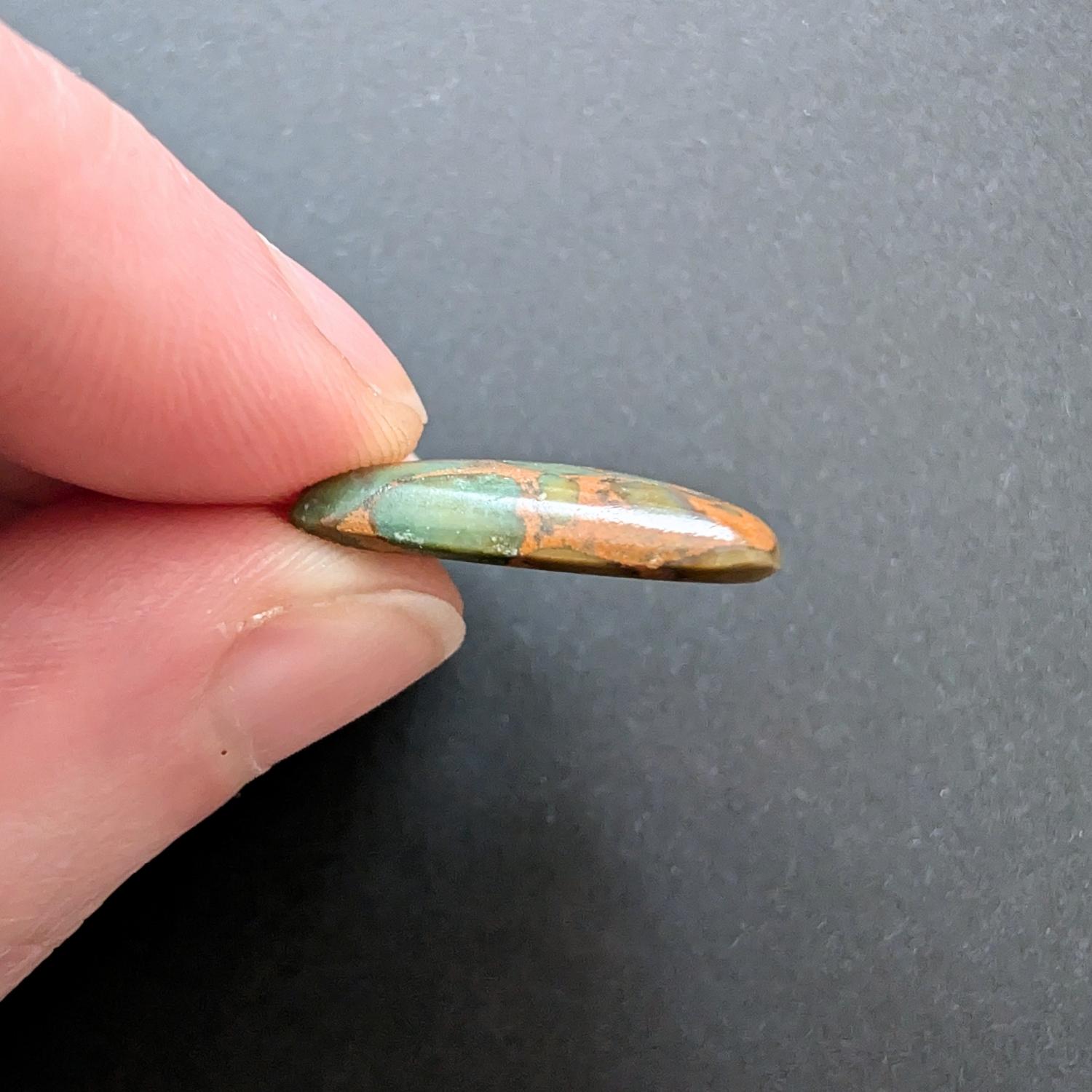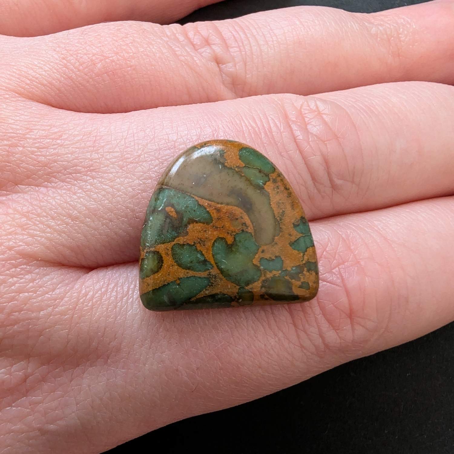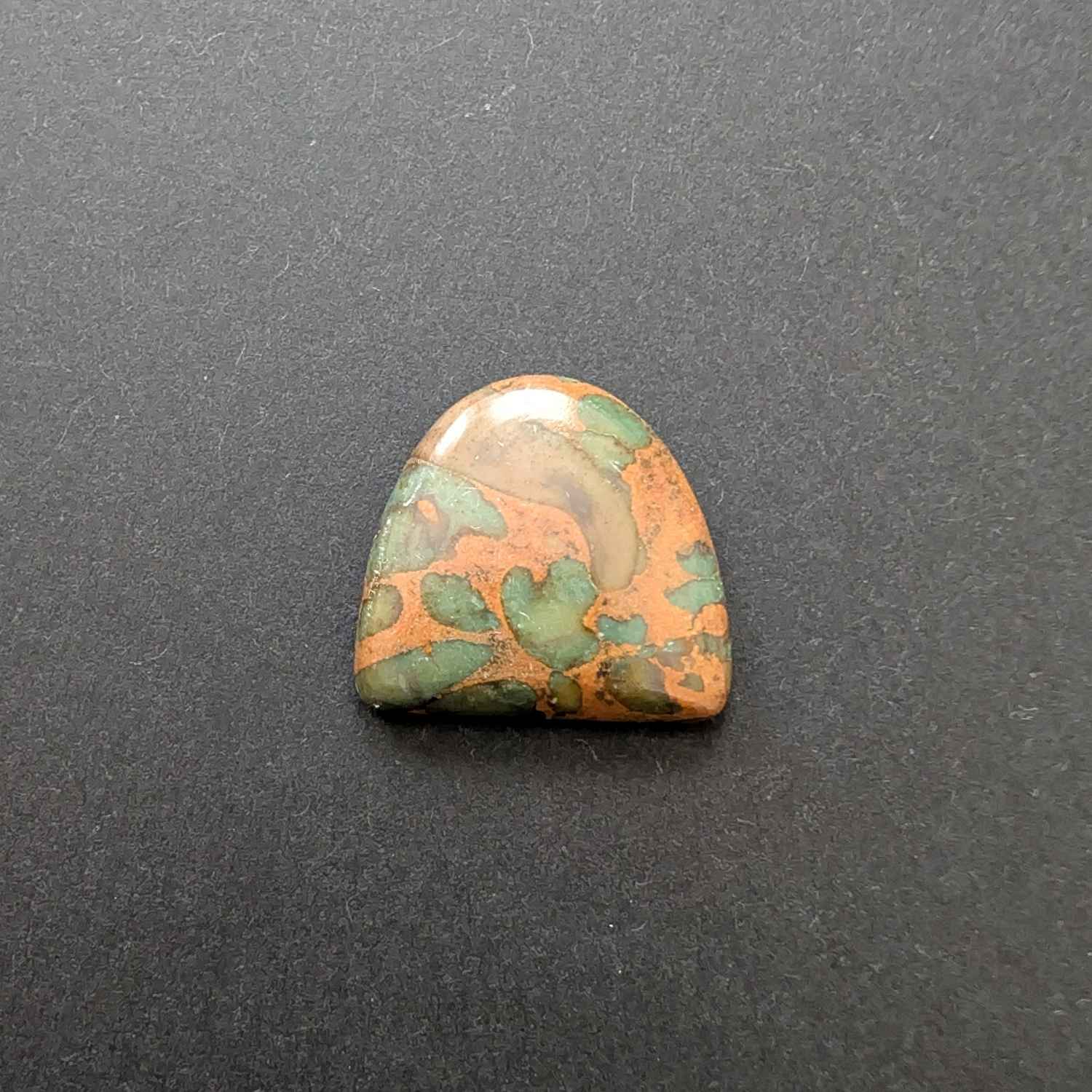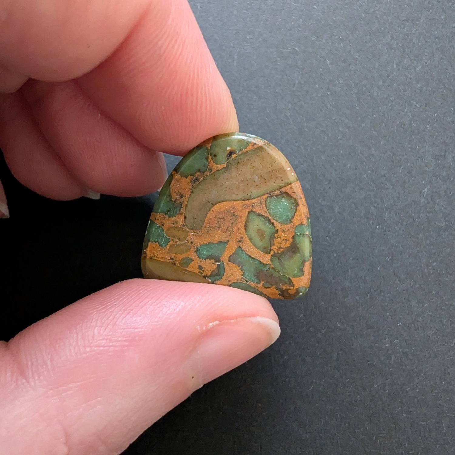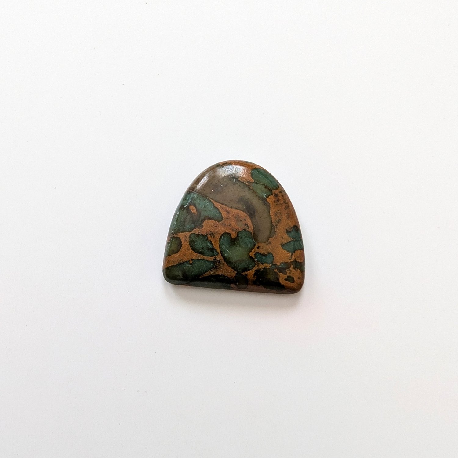 This loose, pre-owned free form fruit jasper cabochon, with its mix of browns, and greens, is ideal for one-of-a-kind jewellery creations with a more sustainable edge.