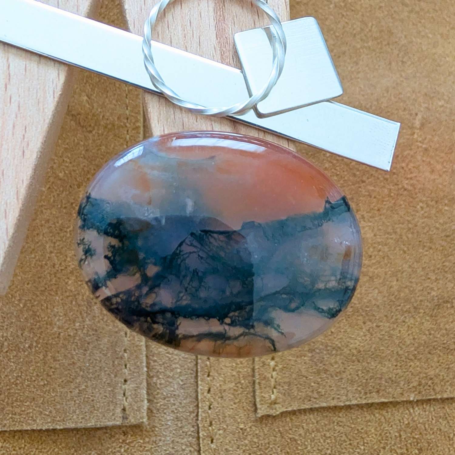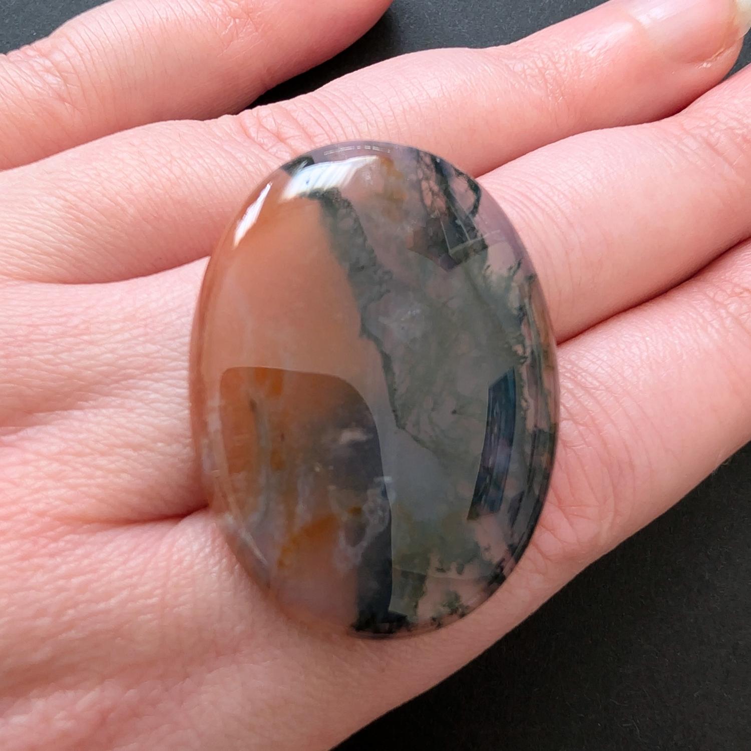 This large, pre-owned oval moss agate cabochon, with its dark green and orangy brown tones, is ideal for one-of-a-kind jewellery creations with a more sustainable edge.