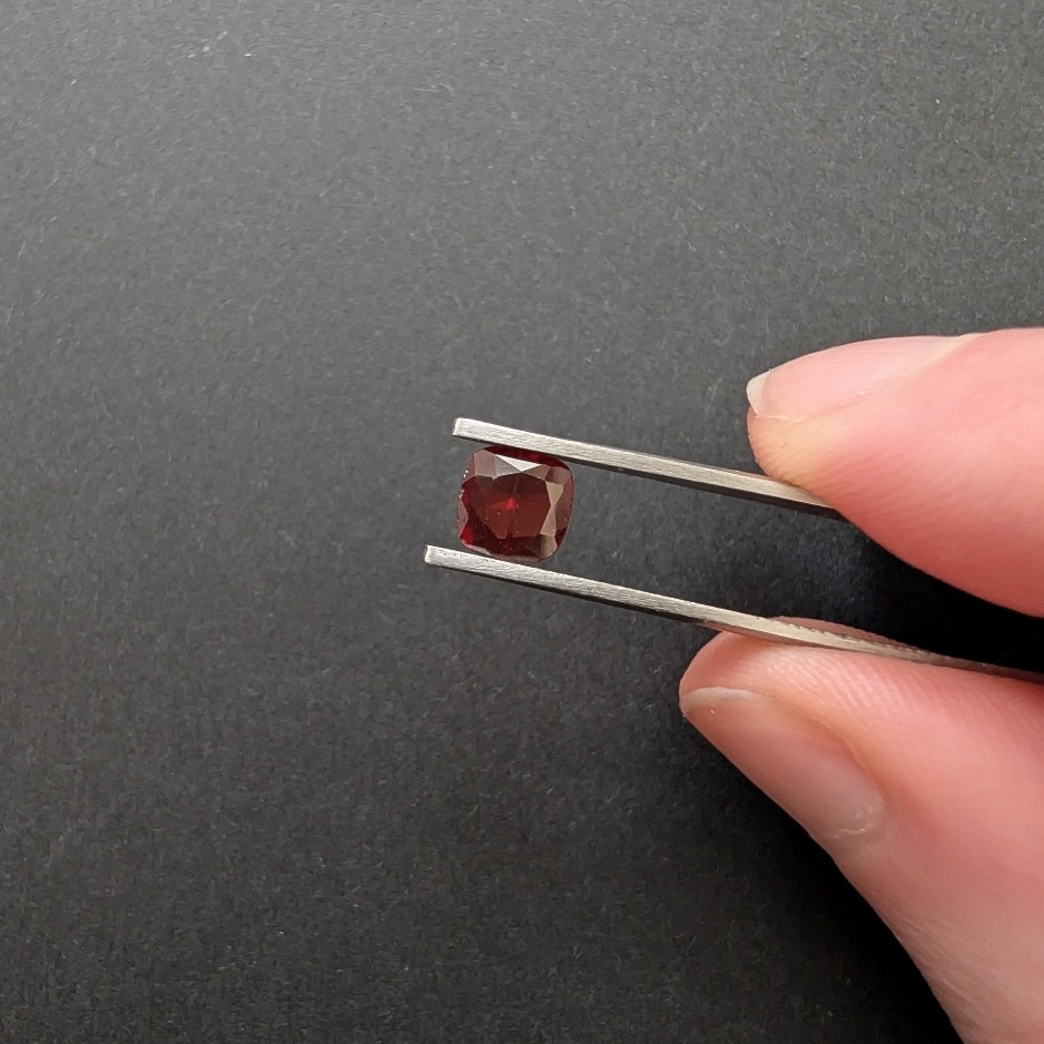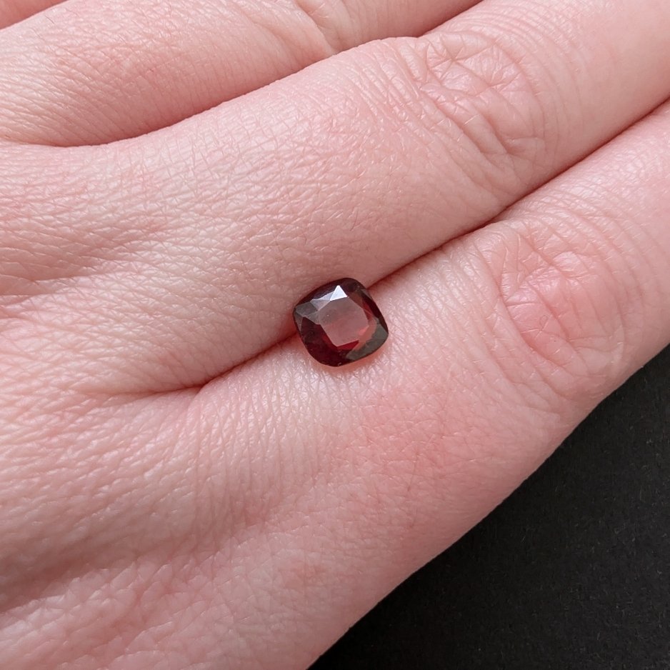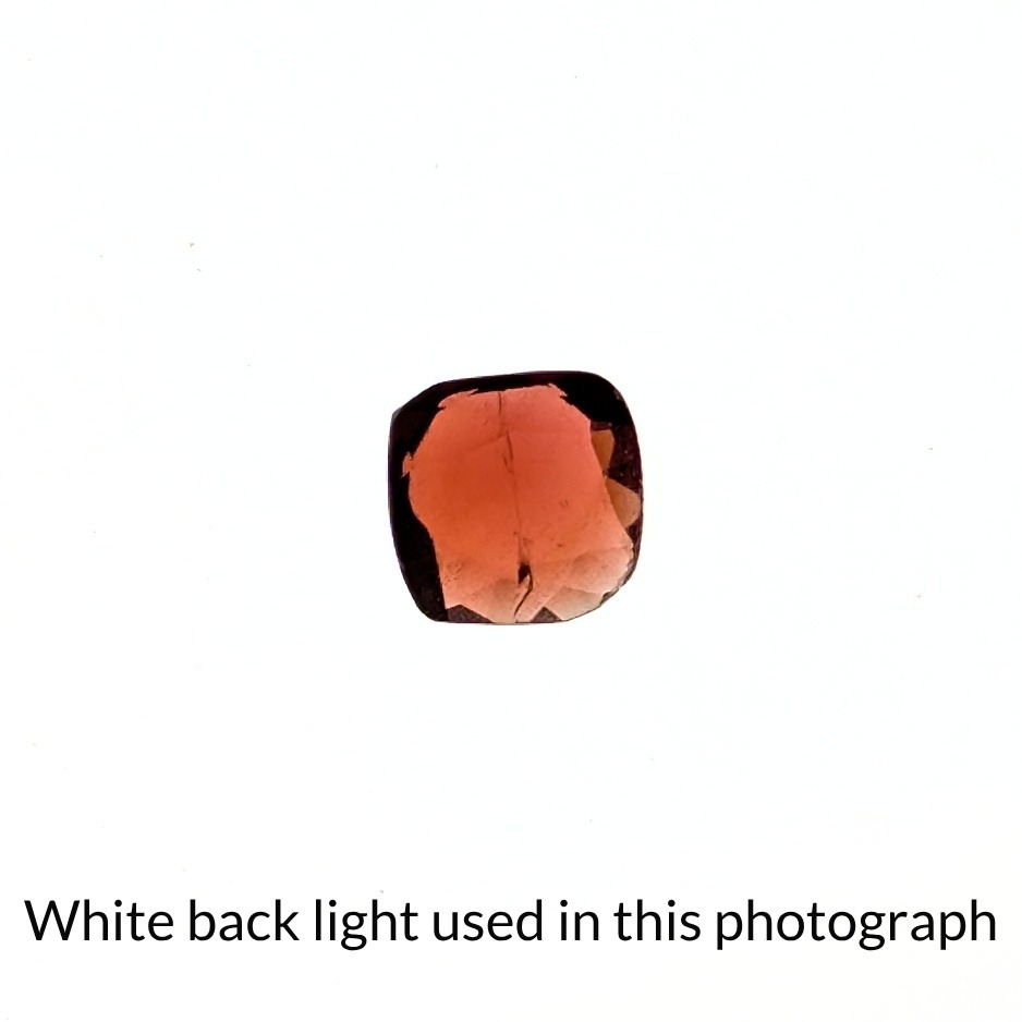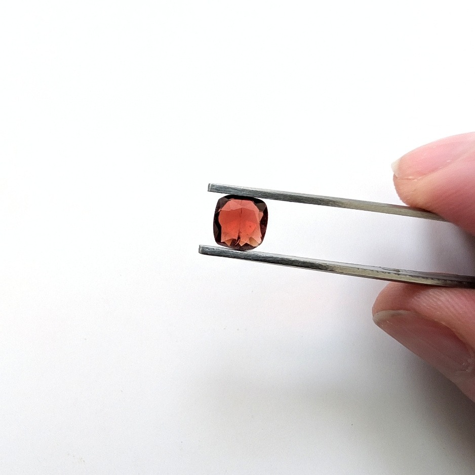 A square cushion pyrope garnet in a warm, fiery orangey red. This pre-owned natural stone has a distinctive shape that suits bold, geometric jewellery designs beautifully. The cut is slightly uneven with one side a little thinner than the other, making it a great choice for a skilled maker who enjoys the creative challenge of working with a gem that has a little quirk to it.