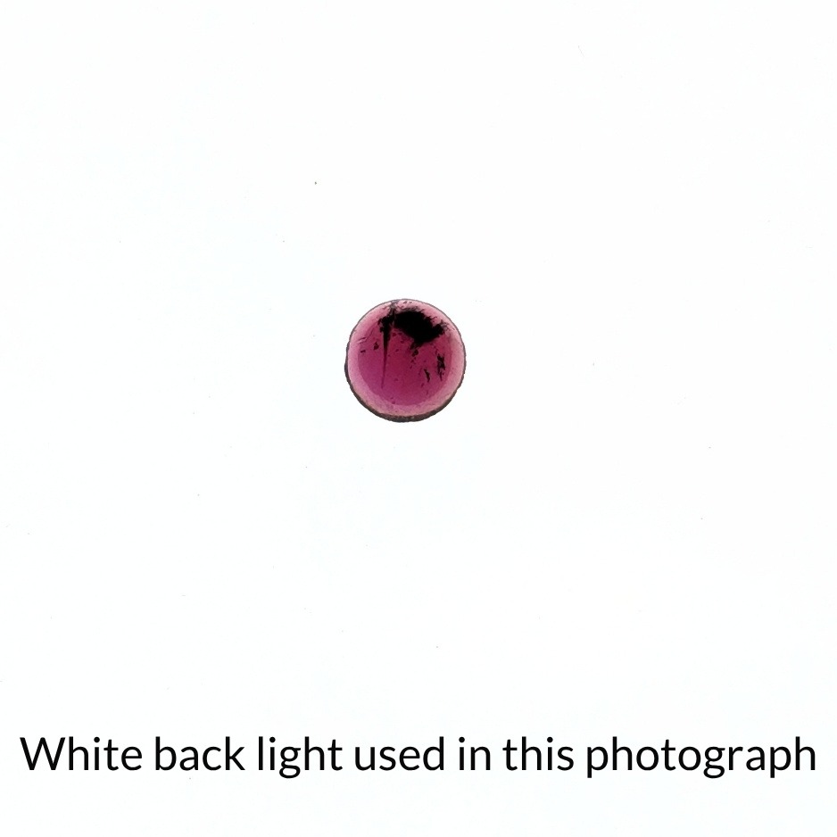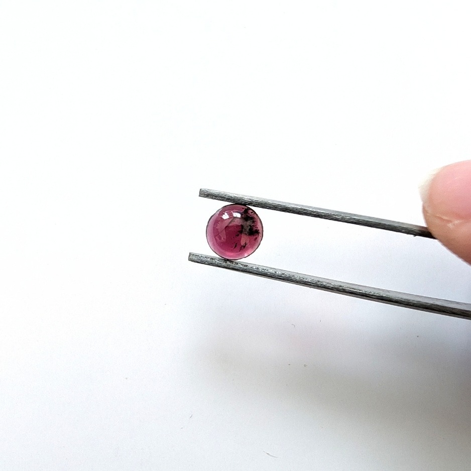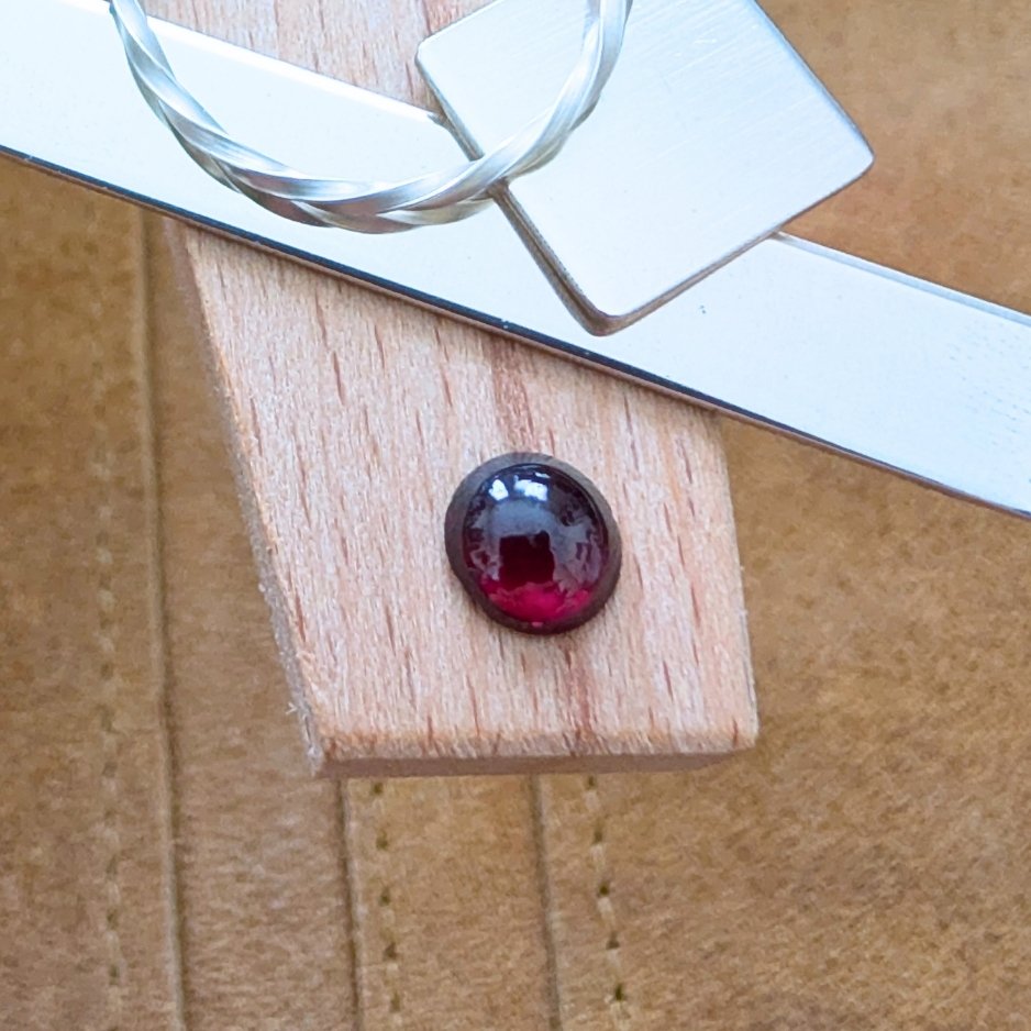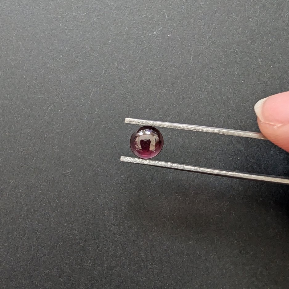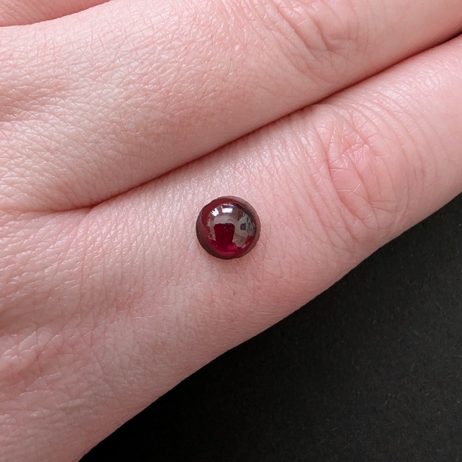 A 6.6 mm round almandine garnet cabochon in a rich slightly purplish red. This neat little stone has the timeless, versatile shape that jewellers always find a use for, from simple stud settings to stacking rings and beyond. Pre-owned and untreated, it’s a sustainably sourced natural gem with a lot of potential packed into a compact size.